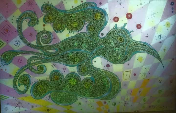 Ten obraz to istna eksplozja kolorów i kształtów, która przyciąga wzrok i nie pozwala się oderwać. W centrum kompozycji widzimy fantazyjny kształt przypominający ptaka, pełen zawirowań i detali. Zastosowane kolory – zielenie, żółcie, różne odcienie niebieskiego – przenikają się tworząc wrażenie ruchu. Kompozycja jest symetryczna, ale jednocześnie dynamiczna, jakbyśmy patrzyli na coś z baśniowej krainy. Atmosfera obrazu jest magiczna i trochę tajemnicza. Kolorowe tło zdaje się pulsować, rozświetlając przestrzeń wokół. Czuję, jakby ten ptak miał zaraz wznieść się w powietrze. Styl? Taki surrealistyczny, pełen szczegółów. Technika użyta przez artystę przypomina mikroskopijną inkrustację, każda linia jest precyzyjnie wykonana. Obraz może budzić różne emocje – od zachwytu nad pięknem detali po rozważania, co artysta chciał przez to powiedzieć. Może to po prostu przypominać dziecięce opowieści, gdzie rzeczy stają się żywe. Wow, a to ptak! Małe dzieci patrząc na to mogłyby powiedzieć coś w stylu: "Patrz mamo, to ptasior!". I choć tempo naszego codziennego życia bywa szybkie, to patrząc na ten obraz, można na chwilę zwolnić. W tym artystycznym "worldzie" czujemy się jak w kalejdoskopie marzeń. Ten obraz to podróż, do której bilet to tylko wyobraźnia.