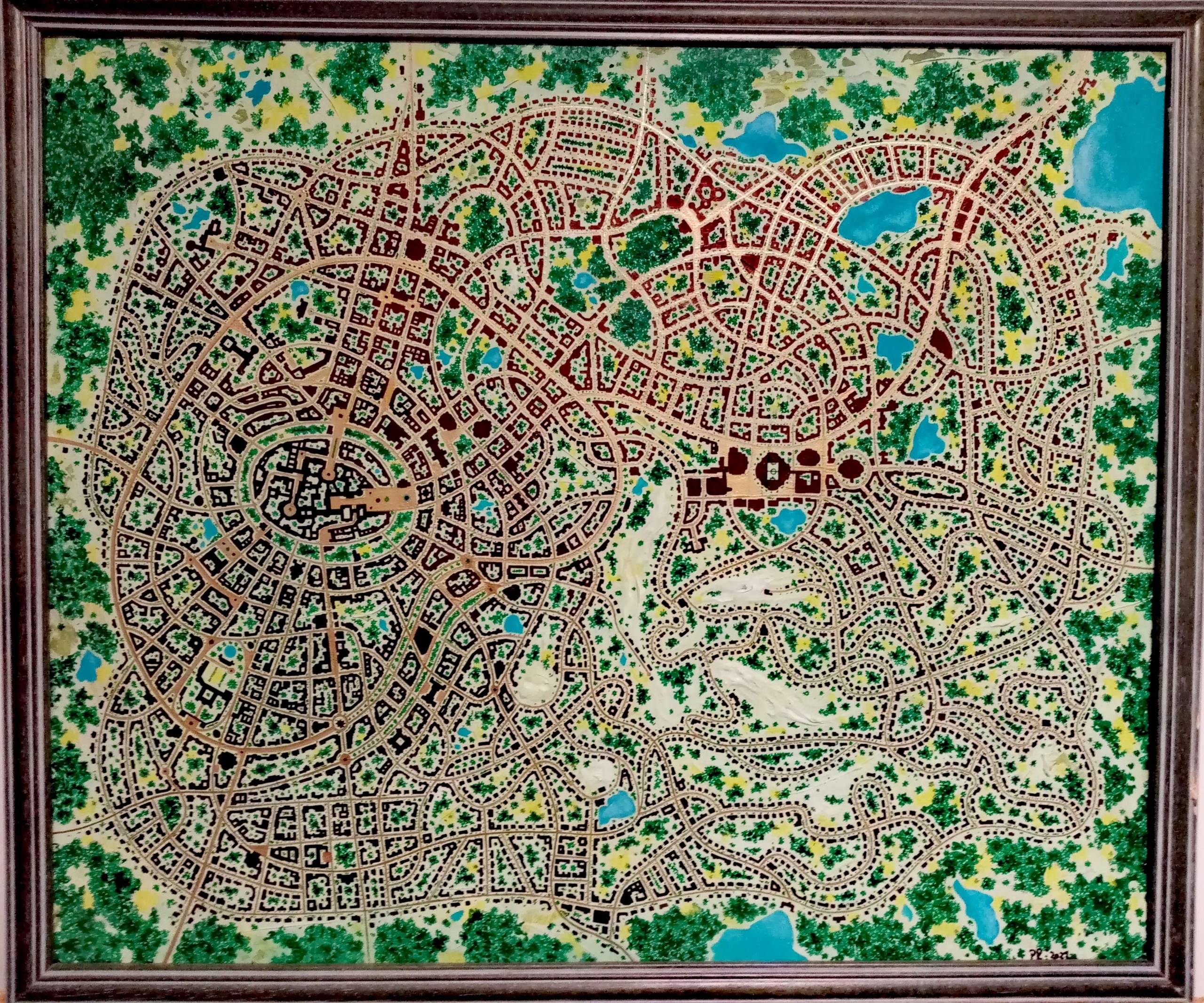 Obraz przedstawia fascynującą mapę o wręcz magicznym charakterze, pełną krętych uliczek i zieleni. Dominuje tu paleta zieleni, brązów i błękitu, które razem tworzą harmonijną całość. Kręte drogi i placówki są rozmieszczone w zawiłej sieci, przypominającej labirynt pełen tajemnic. Kompozycja jest chaotyczna, a jednak w tej chaotyczności kryje się pewien order. Atmosfera obrazu jest pełna życia. Można wręcz poczuć, jak miejsca te pulsują energią i powietrzem przesiąkniętym historią. Styl dzieła przypomina surrealistyczny pejzaż, a techniki, jakimi posłużył się artysta, zdają się być mieszanką akwareli i drobiazgowej ręcznej roboty. Obraz wywołuje w odbiorcy poczucie ciekawości i chęci odkrywania, jakby każde spojrzenie mogło odkryć nową tajemnicę. Dla siedmioletniego dziecka to mapa do skarbów, gdzie każda kropka byłaby domkiem wróżek. A może to miejsce marzeń, gdzie można się zgubić i odnaleźć na nowo. Dla mnie osobiście to "incredible" zaproszenie do podróży w nieznane.
