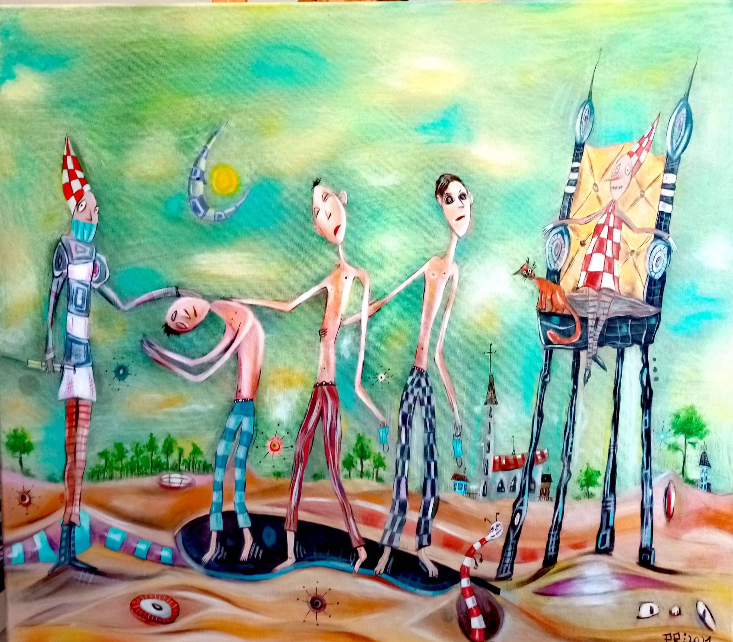 Obraz przedstawia surrealistyczną scenę pełną nieprawdopodobnych postaci i kształtów. Dominują pastelowe kolory – zieleń, błękit i róż, które tworzą atmosferę subtelnej niepewności. Kompozycja jest dynamiczna, wypełniona cienkimi, długimi sylwetkami, które sprawiają wrażenie jakby tańczyły w swoim własnym, dziwacznym rytmie. Z jednej strony widzimy postać przypominającą robota z czapeczką w czerwono-białą kratkę, a z drugiej wysoki tron z nieokreśloną istotą i kotem siedzącym na oparciu. A w tle zarysowuje się księżyc i słońce, jakby spoglądając na całą scenę. Nastrój obrazu jest jednym z tych, co wprawiają widza w reflective mood (właśnie taki jest nastrój) z lekkim poczuciem dezorientacji. Artysta posługuje się stylem surrealizmu, który podkreślają delikatne, miękkie linie i nierealistyczne proporcje postaci. Emocje, jakie budzi to dzieło, oscylują między zdziwieniem a fascynacją, z nutką niepokoju. Co to wszystko oznacza? Może to być komentarz na temat relacji międzyludzkich lub samotności w tłumie. A może to po prostu senna fantazja, gdzie wszystko jest możliwe. 7-letnie dziecko powiedziałoby: "A ja widzę kota na tronie, jakby był królem wszystkich kotów!". Obraz, przypominający świat z pogranicza snu i jawy, inspiruje do osobistych refleksji. Przemawia do widza językiem marzeń i pozwala na własną interpretację, pozostawiając odbiorcę z pytaniami, które mogą nigdy nie znaleźć odpowiedzi.