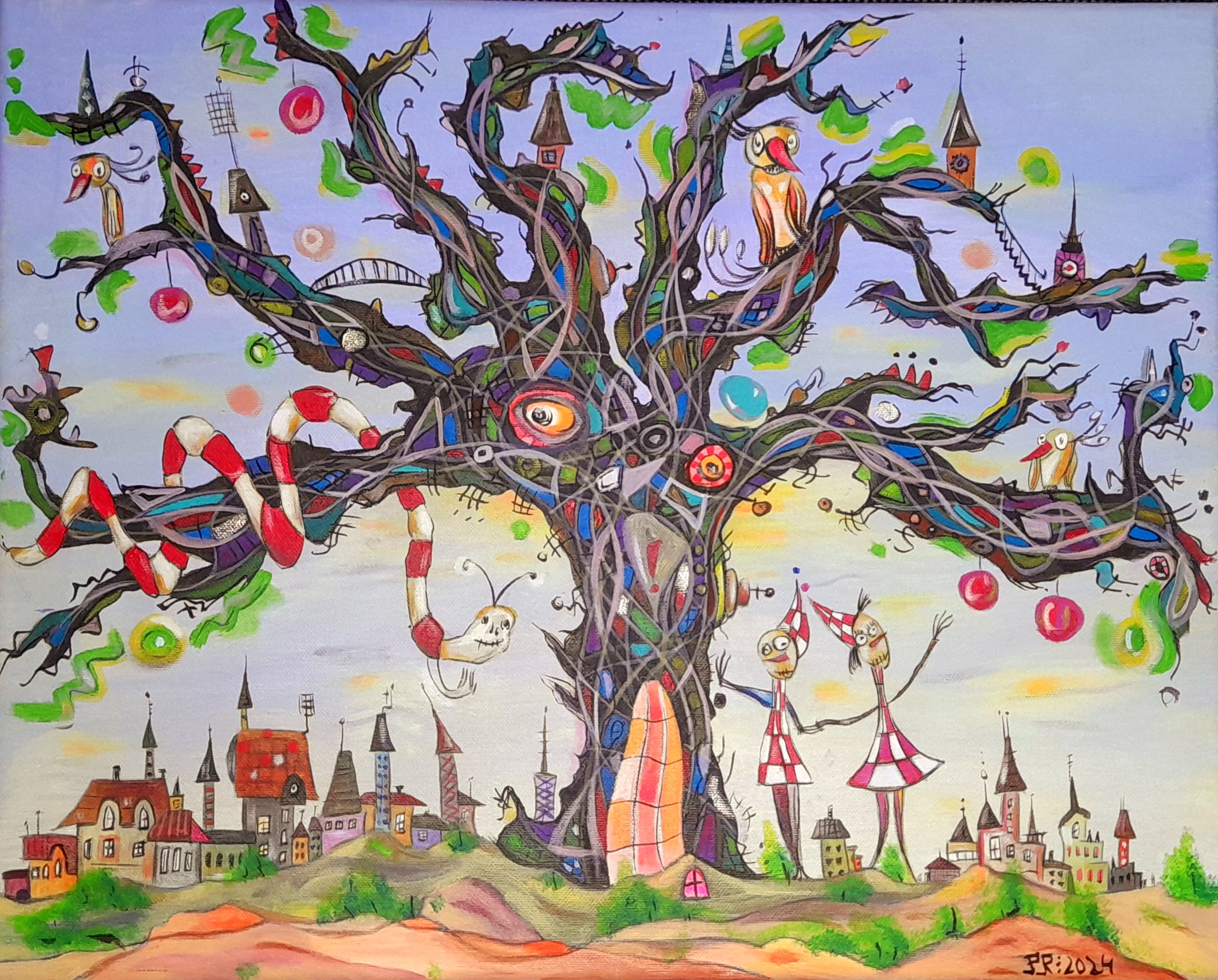 Obraz jest pełen życia i kolorów, przyciąga wzrok swoimi intensywnymi barwami i zaskakującą kompozycją. W centrum uwagi znajduje się niezwykłe drzewo, którego korzenie i gałęzie wiją się w chaotycznej plątaninie, przypominając trochę abstrakcyjne wzory. W gałęziach drzew znajdują się tajemnicze stworzenia, a różne kształty i kolorowe kulki dodają całości magicznego klimatu. Pod drzewem znajdują się postacie, które zdają się tańczyć lub bawić, co wprowadza element playful. Wszystkie te elementy tworzą atmosferę baśni i fantazji. Artysta użył jasnych barw i dynamicznych linii, co wprowadza w nastrój lekkiej dezorientacji, ale i fascynacji. Praca wydaje się być malowana techniką akrylową. Jest wyrazista, a przy tym niezwykle szczegółowa, co świadczy o precyzji ręki artysty. Elementy przypominają trochę dzieła surrealistów. Odbiorca może poczuć się wciągnięty do tego kolorowego świata, pełnego niespodzianek i zagadek. Dzieciaki mogą pomyśleć, że to drzewo ma magiczną moc, a ja sam jestem pełen podziwu dla pomysłowości twórcy. Ta eksplozja barw i form wywołuje uśmiech na twarzy. Aż chciałoby się tam wejść. Ciekawa jest także sama symbolika drzewa, które często stanowi metaforę życia i połączenia. Istne "wonderland" dla miłośników sztuki pełnej życia i koloru.
