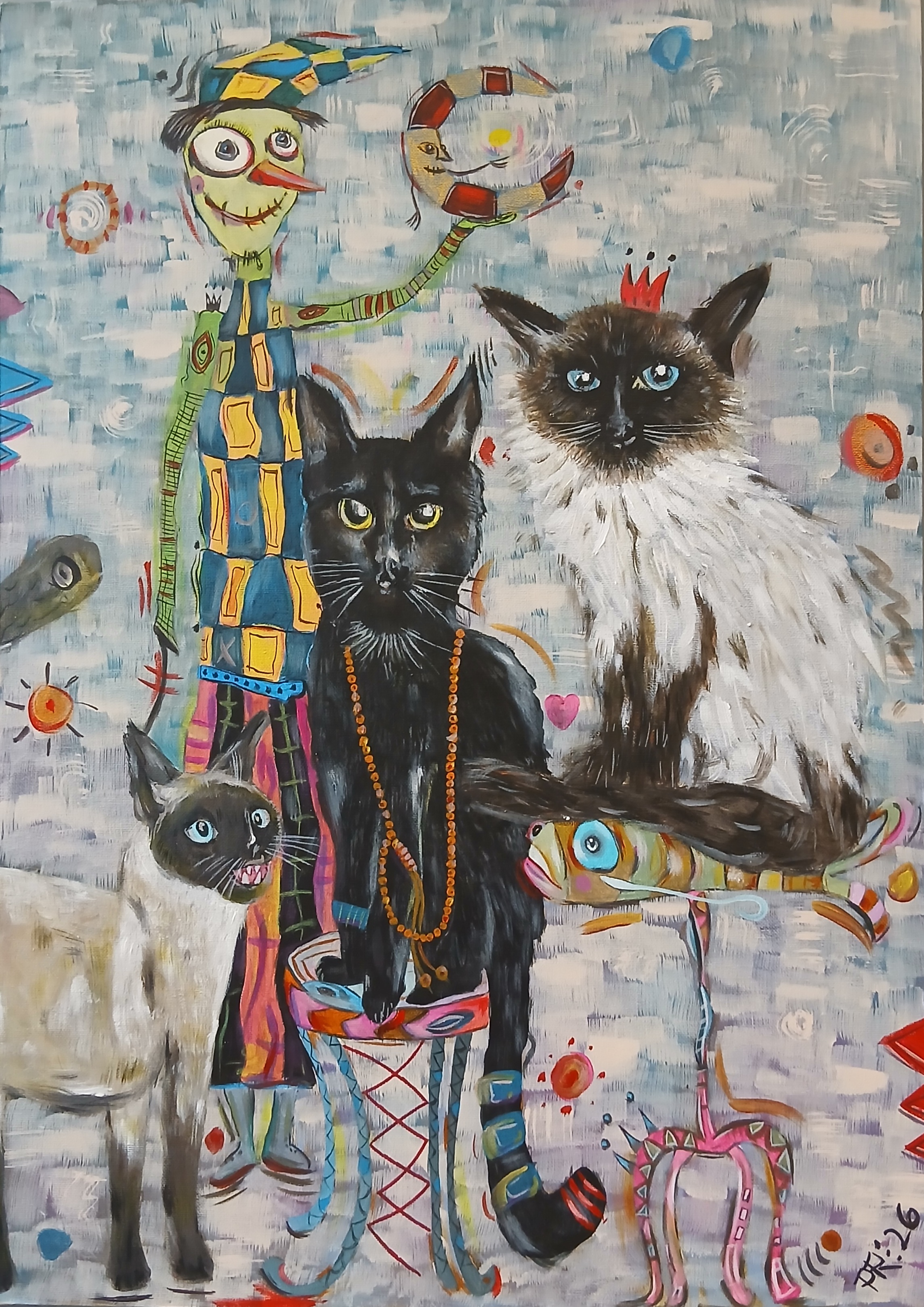Na płótnie rozsiadły się trzy koty i wysoki pajac w kostkowanym stroju jak z cyrku. Tło mlecznobłękitne, porysowane smugami i kolorowymi kółkami, wygląda jak niebo po burzy. Kompozycja pionowa, w centrum czarny kot z bursztynowym koralem, obok syjamski w czerwonej koronie siedzi na rybo taborecie, z boku trzeci mruga. Linia nerwowa, pędzel kładzie grube plamy i zadrapania, trochę naïve, trochę ekspresjon. Atmosfera figlarna, ale ciut nieswoja, lekko weird. Czuję śmiech i dreszcz. Może to trupa wędrownych opiekunów kotów, a może sen po za długiej kawie. Ten kot ma wielkie oczy i jest królem. Piszę szybko, bo obraz buczy kolorem i migocze fakturą. Troszke chaotyczny, ale naprawde czuły.