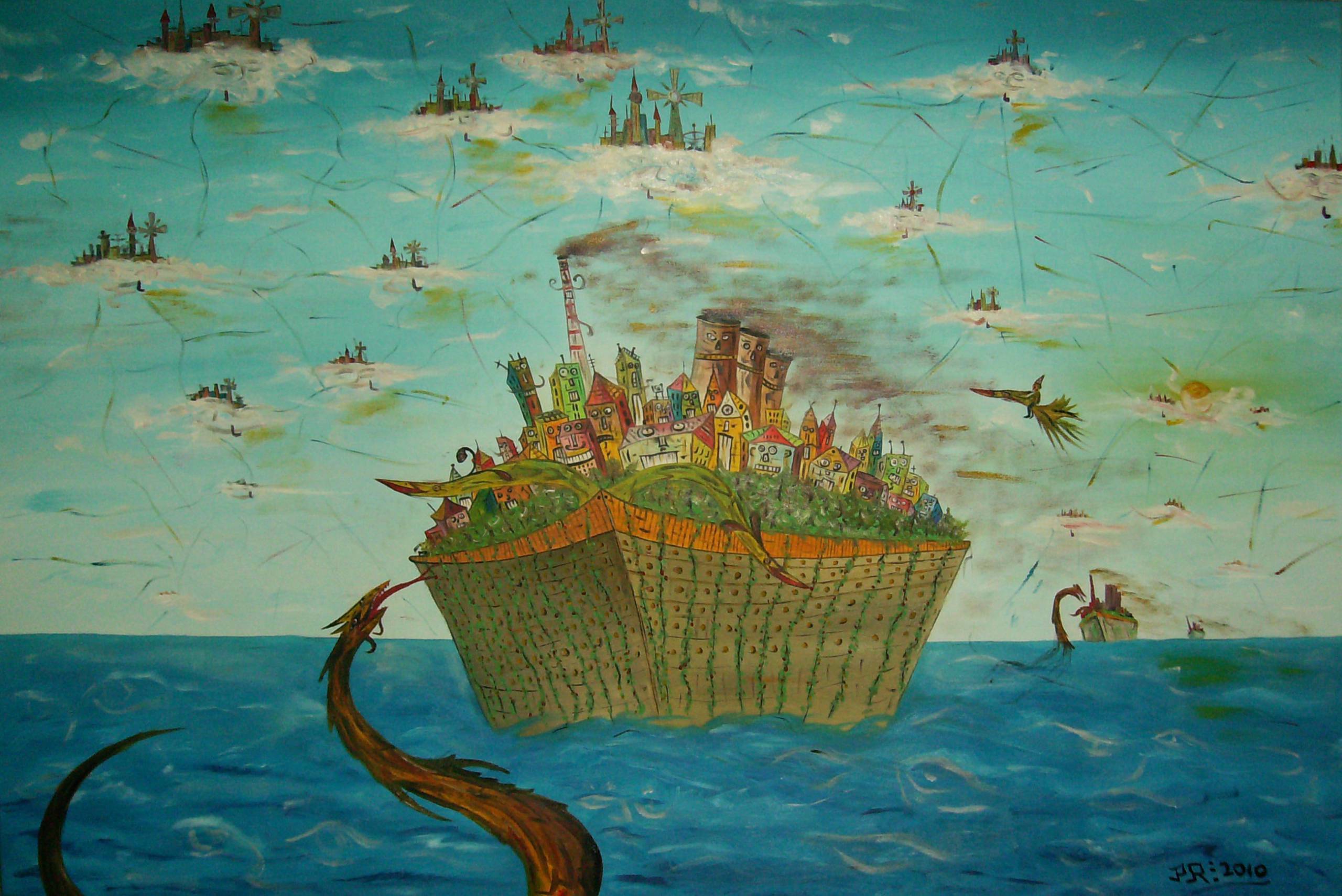 Obraz emanuje feerią kolorów; turkusowe niebo kontrastuje z głębią błękitu morza, na którym unosi się gigantyczny, przypominający wielki statek ląd z kolorowymi domkami. Wygląda to wszystko jak coś z bajki, może nawet trochę surrealistycznie. Kształty domków są nieregularne, pełne fantazyjnych detali. Dokładnie przyglądając się, można dostrzec radosne twarze na fasadach budynków. Taki statek-dziwak, do którego lecą smoki! Atmosfera jest pełna nostalgii i magicznego spokoju; jakby ktoś zatrzymał czas w świecie pełnym niesamowitych istot. Artysta zastosował technikę mieszania barw i odważne pociągnięcia pędzla, co nadaje całości dynamicznego rytmu. Może trochę jak sen? Wywołuje emocje związane z poszukiwaniem przygód, zaciekawienie i lekką tęsknotę za nieznanym światem. To miejsce, gdzie dziecięca wyobraźnia staje się rzeczywistością. Is it a dream or reality? To pytanie samo się narzuca. Patrząc na ten obraz, można się poczuć jak odkrywca, który ma ochotę popłynąć w nieznane, szukając własnych chmur pełnych magii. Przypomina to dziecięcy rysunek wielkiej przygody, gdzie dobre smoki mieszkają zaraz za chmurką.