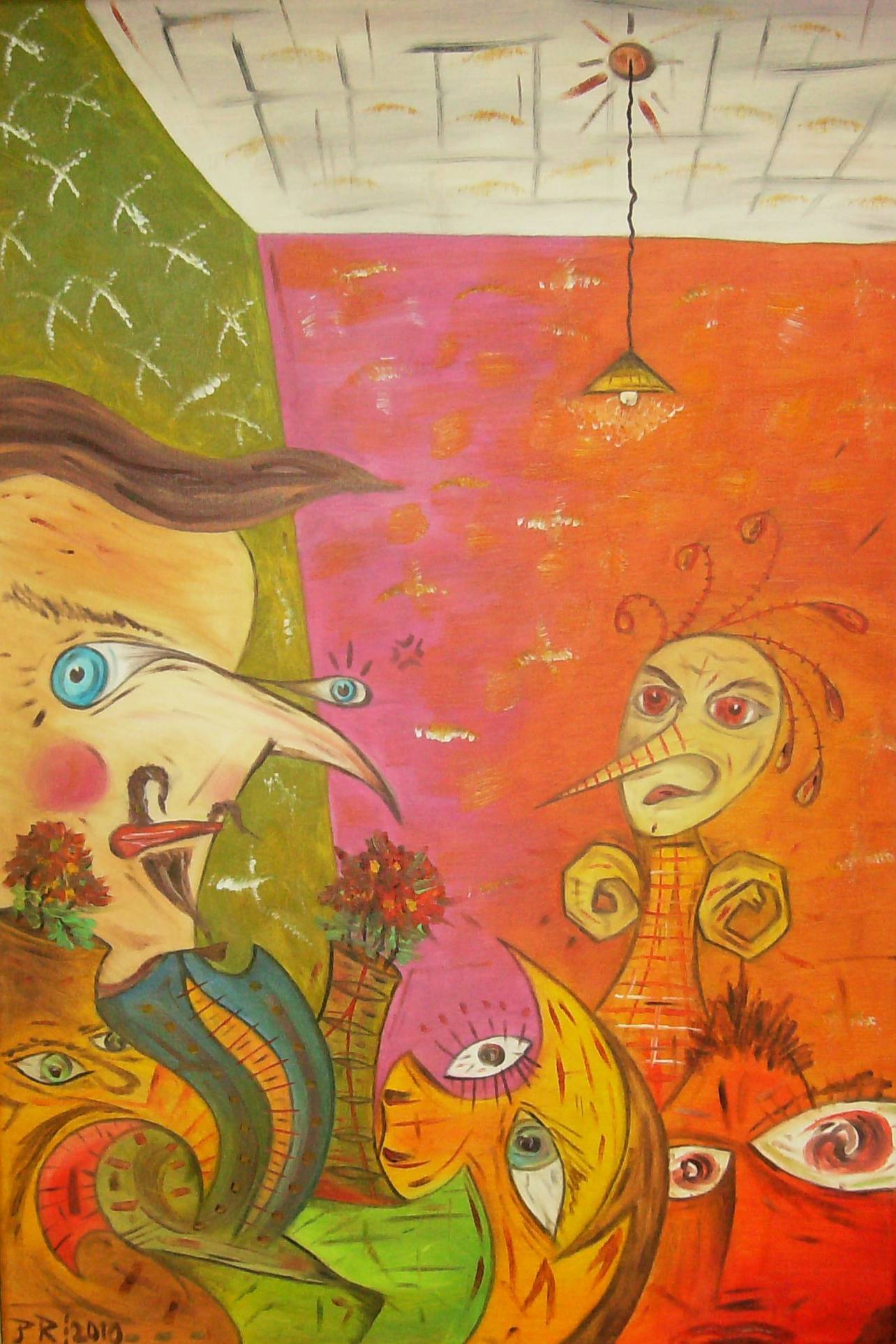 Obraz zachwyca burzą kolorów, w której dominują intensywne odcienie różu, pomarańczu i zieleni. Przeważają abstrakcyjne kształty, które splatają się ze sobą w nieoczywisty sposób. Centralna postać ma wydłużoną twarz, nieco zniekształconą, co nadaje dziełu surrealistyczny charakter. Takie połączenie wywołuje nieco niepokojący nastrój, ale jednocześnie fascynuje. Atmosfera obrazu przypomina senne wizje lub fantazje z dzieciństwa. Artysta używa ekspresyjnych pociągnięć pędzla i nieskrępowanej kompozycji. Technika przypomina nieco surrealizm, ale z nutą własnego, unikalnego stylu. Patrząc na ten obraz, można poczuć zarazem zagubienie, jak i ciekawość. Może on przypominać chwile z dzieciństwa, kiedy wyobraźnia bawiła się formą i kolorem. Dla dzieci, to wygląda jak świat z bajki, gdzie wszystko jest możliwe. Może nawet wywołać uśmiech, bo czasem chaos i kolory są po prostu fun! Refleksja nad tym, jak często pozwalamy sobie na taką swobodę myślenia w dorosłym życiu, staje się nieunikniona. Obraz ten to “burst” kreatywności, który przyciąga wzrok i zmusza do przemyśleń.