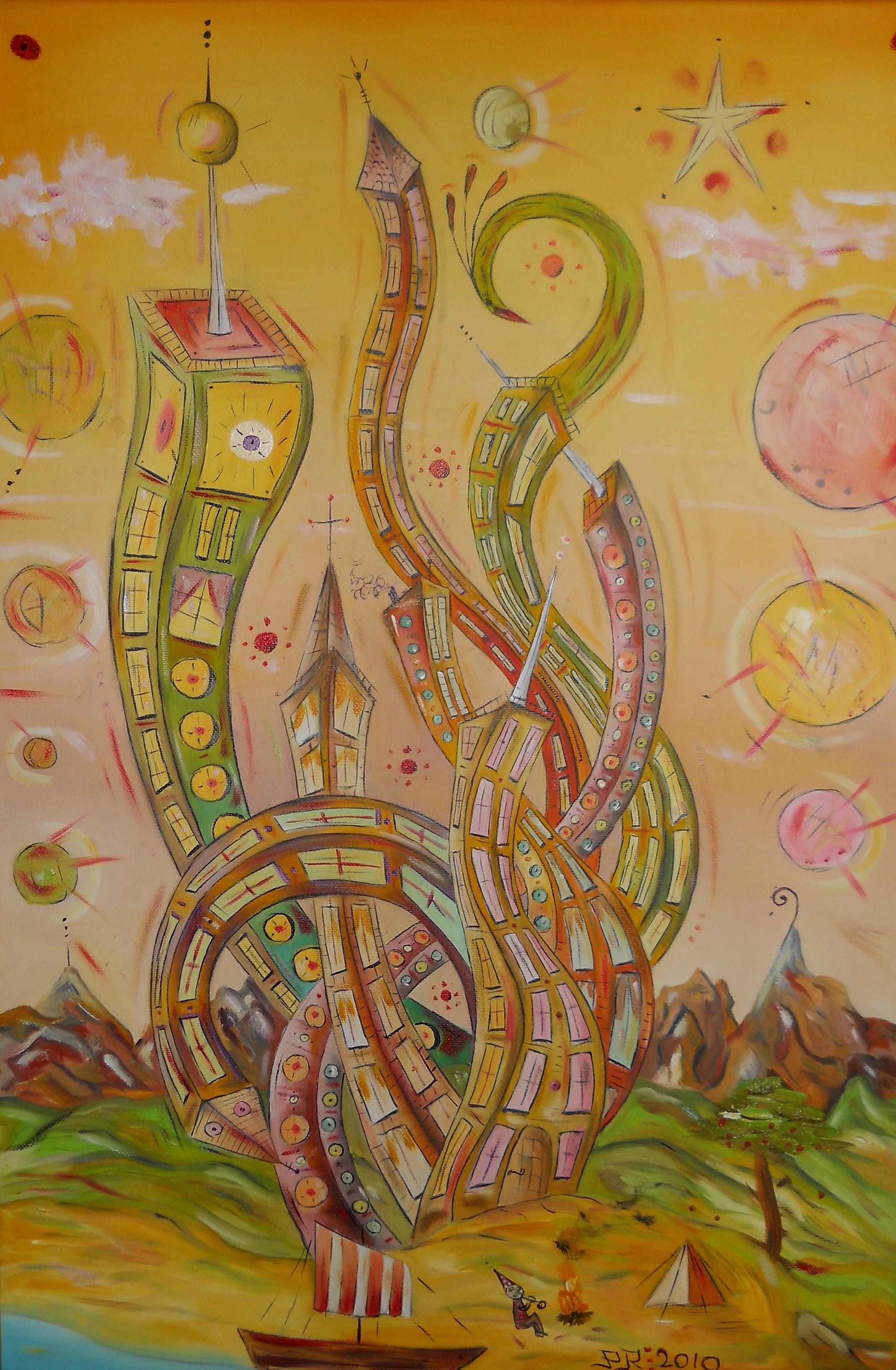 Obraz tętni kolorami i fantazyjnymi kształtami, które zdają się tańczyć na złocistym tle. Wygięte wieże, przypominające zbyt długie balony, wzbijają się ku górze, łamiąc prawa grawitacji. Zastosowano tu styl przypominający surrealizm, z elementami science fiction. Krzywe linie i pastelowe kolory – przeważają różne odcienie żółtego, zieleni i różu. Atmosfera jest bajkowa, niosąca ze sobą uczucie lekkości i marzycielstwa. Ciekawe jest to, jak artysta wykorzystał technikę swobodnych pociągnięć pędzla, nadając pracy dynamiczny charakter. Obraz emituje nastrój beztroski i poczucia, że wszystko jest możliwe. Może wywoływać refleksję o tym, jak postrzegamy architekturę i przestrzeń wokół nas. Dla dziecka to mógłby być magiczny świat, w którym wieże rosną jak rośliny. A te kolorowe balony wyglądają jak cukierki! Prawda? Patrząc na to dzieło, czuję przypływ dobrego humoru, jakbym nagle znalazł się w "dreamworld", gdzie ograniczenia nie istnieją. Artysta zabiera nas w podróż do krainy wyobraźni, zapraszając do zgubienia się w jej zakamarkach.