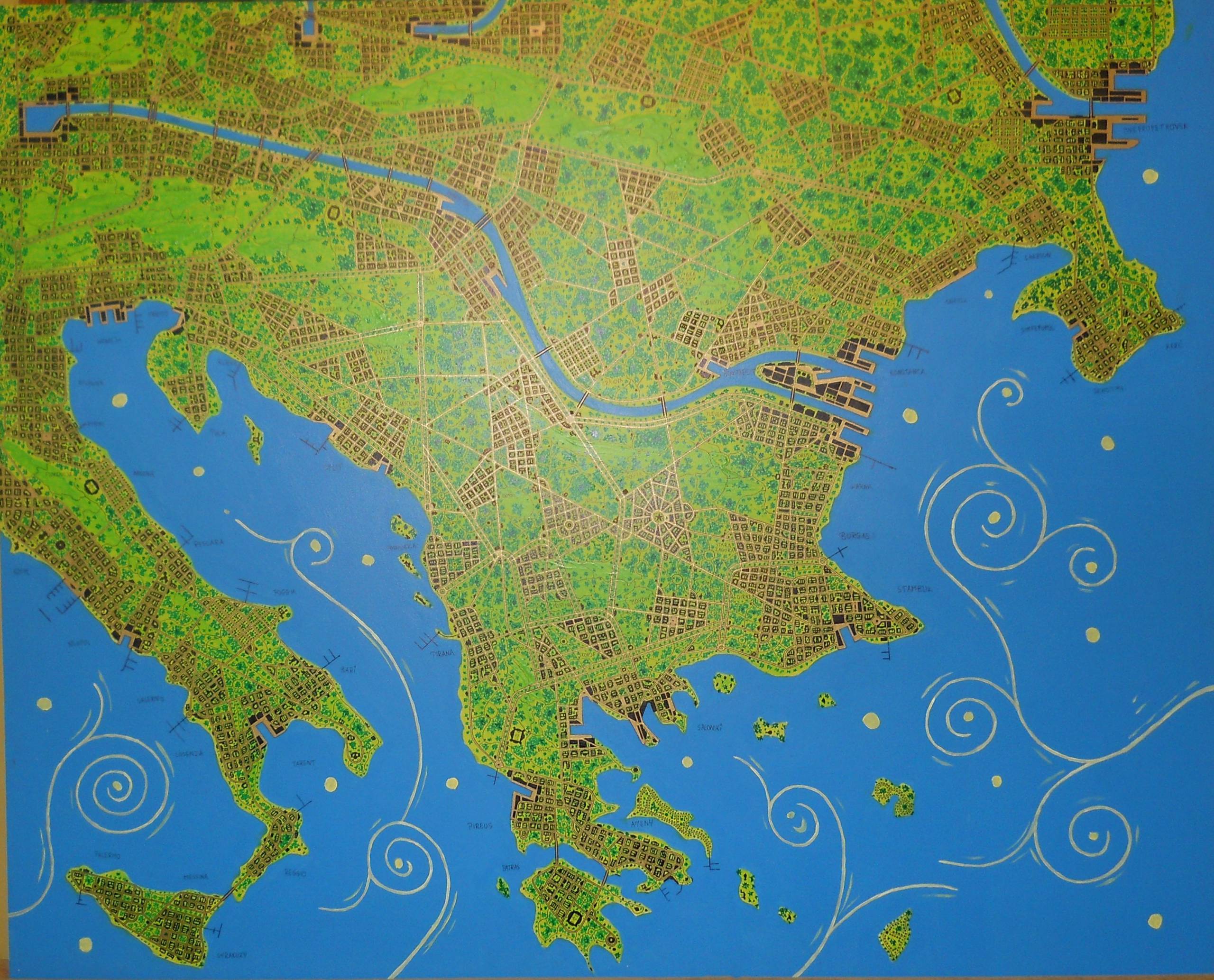 Na tym obrazie dominują intensywne odcienie zieleni przeplatające się z błękitnym tłem morza. Kompozycja mapy ukazuje starannie zaplanowaną sieć ulic i portów, co daje wrażenie harmonii i porządku. Miejskie krajobrazy wtopione w przyrodę tworzą swoisty dialog między architekturą a naturą. Jest coś magicznego w tym, jak artysta splótł kształty miast z krętymi liniami wody, tworząc niepowtarzalną mozaikę. Atmosfera? Ach, tchnie spokojem, choć zarazem pobudza do refleksji nad pięknem zrównoważonego rozwoju. Styl artystyczny przypomina trochę mapy fantasy, gdzie rzeczywistość łączy się z wyobraźnią. Techniki malarskie, no, może nie są tu wirtuozerskie, ale wyraziste linie i kontrasty kolorów budują niepowtarzalny klimat. Obraz wywołuje ciekawość, skłania do zastanowienia się nad miejscem człowieka w tym uporządkowanym chaosie. Ktoś powie: It's like a dream world. Dla dziecka to po prostu mapa skarbów, gdzie każda kraina kryje tajemnice. Osobiście, czuję lekki dreszczyk emocji, jakbym na chwilę zanurzył się w alternatywnym świecie pełnym niespodzianek.