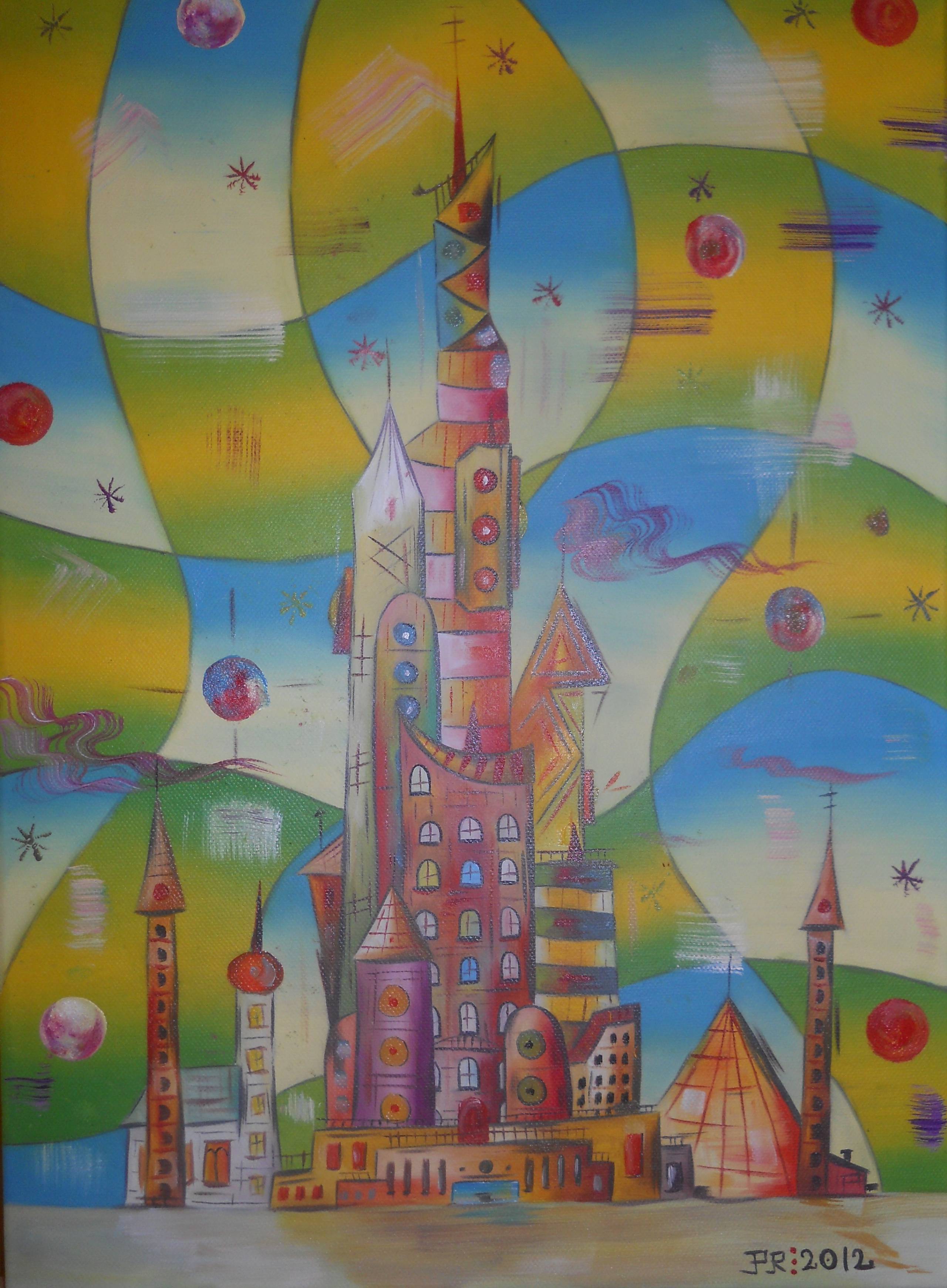 Na obrazie widzimy fantazyjne miasto z wysokimi, kolorowymi wieżami, które zdają się wznosić w stronę nieba. Pastelowe odcienie niebieskiego, zielonego i żółtego dominują kompozycję, tworząc wrażenie bajkowej krainy. Nierówne i wygięte formy budynków sprawiają, że całość wygląda jak marzenia senne, pełne niesamowitych detali i nieregularnych linii. Artysta posługuje się techniką, która łączy elementy surrealizmu z nutką komiksowej fantazji. Przestrzeń tła jest dynamiczna, pełna wirujących kształtów i plam, co nadaje obrazowi ruchu i energii. To takie ciekawe! Wyobraź sobie skąpane w promieniach słońca miasteczko, które właśnie się obudziło, pełne radości i ciepła. Ten obraz wywołuje uczucie marzycielstwa, zachwytu dla dzieci i dorosłych. Kiedy na niego patrzę, czuję lekkość i radość, jakbym przenosił się do magicznego świata. Kolorowe wieże przypominają mi o dziecięcej wyobraźni, której nie ogranicza żadna „realność”. A może to właśnie secret to piękno tego dzieła – pozwala poczuć się wolnym.