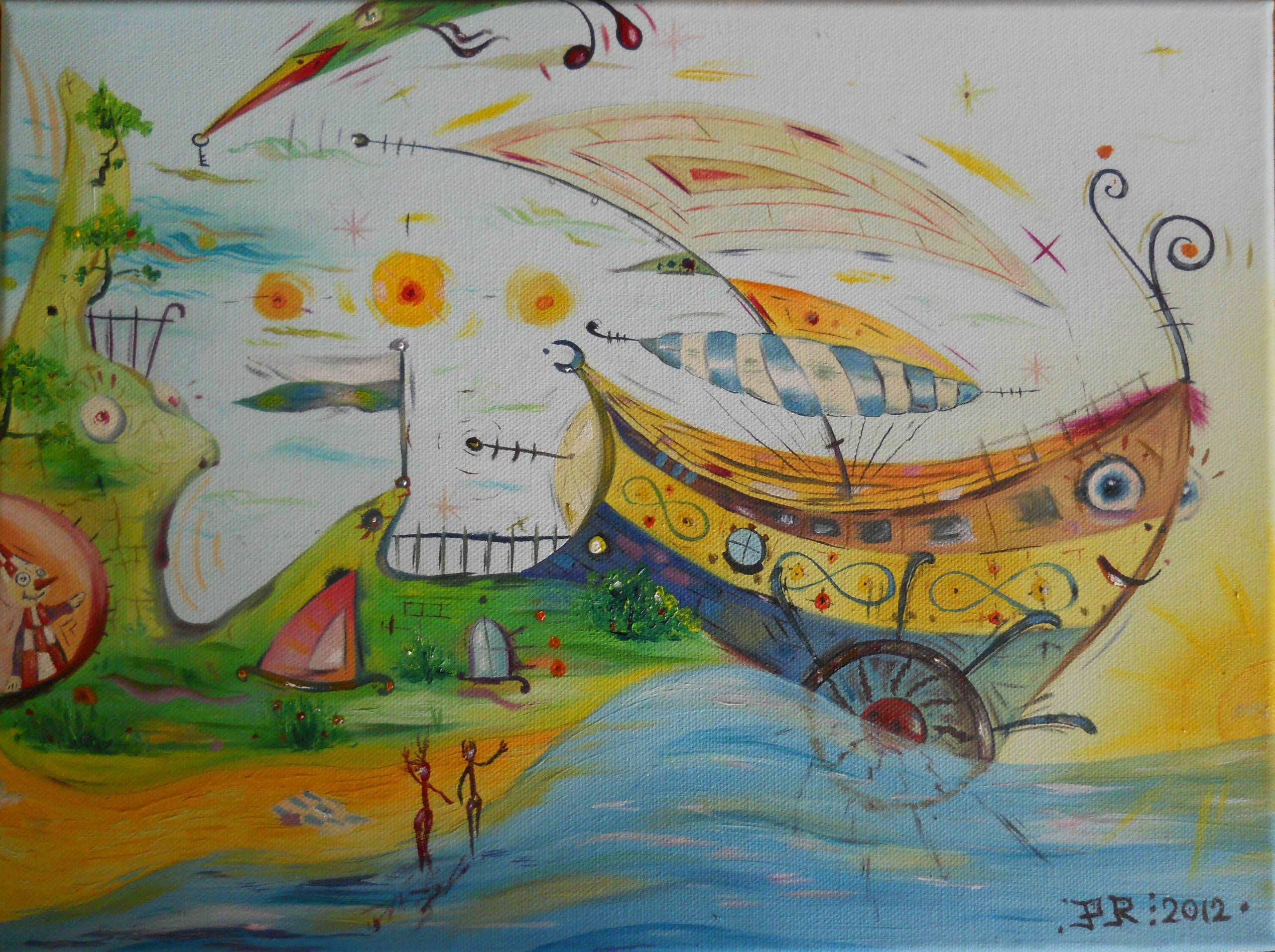 Obraz zachwyca bogatą paletą kolorów, od ciepłych żółci i pomarańczy po chłodne błękity i zielenie. Centralnym elementem jest fantastyczny statek, przypominający dziwaczny pojazd z bajki. Małe detale zdają się opowiadać historie; koło napędowe, jakby żywcem wyjęte z fantastyki, i okrągłe okienka jak oczy pełne ciekawości. Tło to mieszanka surrealizmu i dziecięcej wyobraźni. Popatrz, tam są pagórki, jak twarze ożywione przez rośliny i jasne kwiaty. Atmosfera jest iście magiczna. Może to land of dreams? Styl malarza jest swobodny, z nutką chaotycznej elegancji. Techniką przypomina dziecięce rysunki, pełne spontaniczności i zachwytu. Dla dorosłego to podróż do krainy wyobraźni, dla dziecka to po prostu dom dla niesamowitych przygód. Ten obraz budzi radość i nostalgię, przypominając o niezapomnianych czasach dzieciństwa pełnego marzeń. To jest coś nie do opisania, jakbyś był znowu małym odkrywcą. Możesz wpatrywać się godzinami i wciąż odkrywać nowe szczegóły. Emocje fruwają, mieszają się z bezkresną radością i poczuciem, że świat jest pełen niespodzianek.
