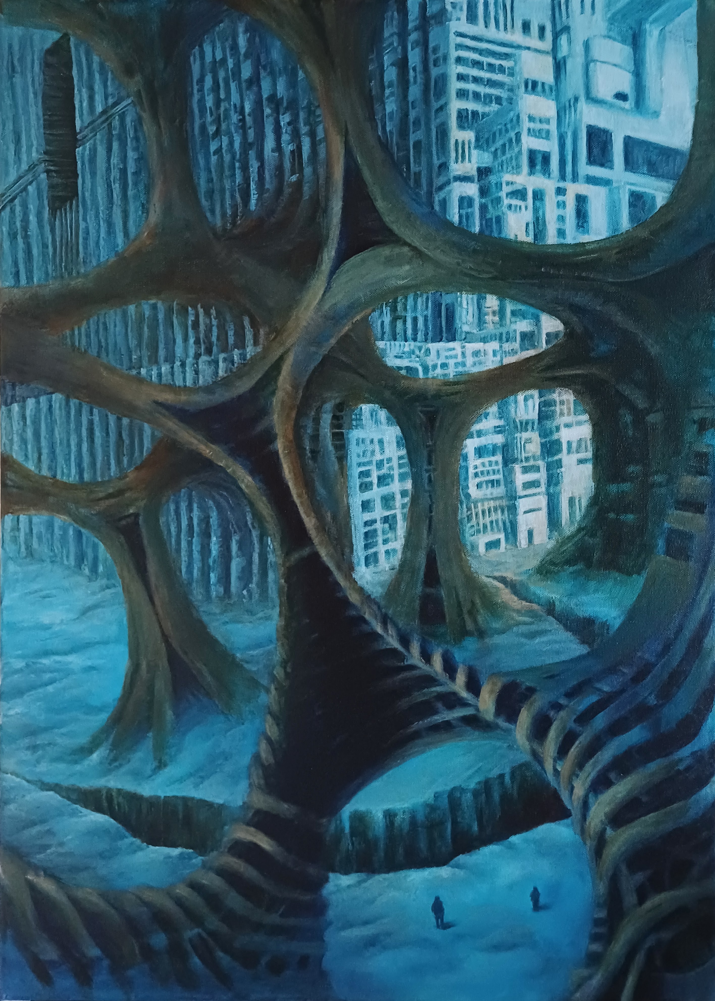 Obraz z cyklu Wędrówka, 2026r. Obraz przedstawia proces kształtowania własnego charakteru, przekształcania doświadczeń w struktury budujące naszą tożsamość. 2026 Wystawa indywidualna "Wędrówka", Dom Pełen Kultury, Staniątki 2026 Nagroda w konkursie Artist of the Month - Camelback Gallery, USA