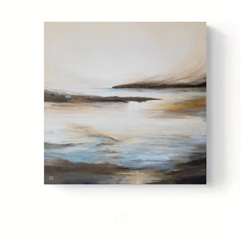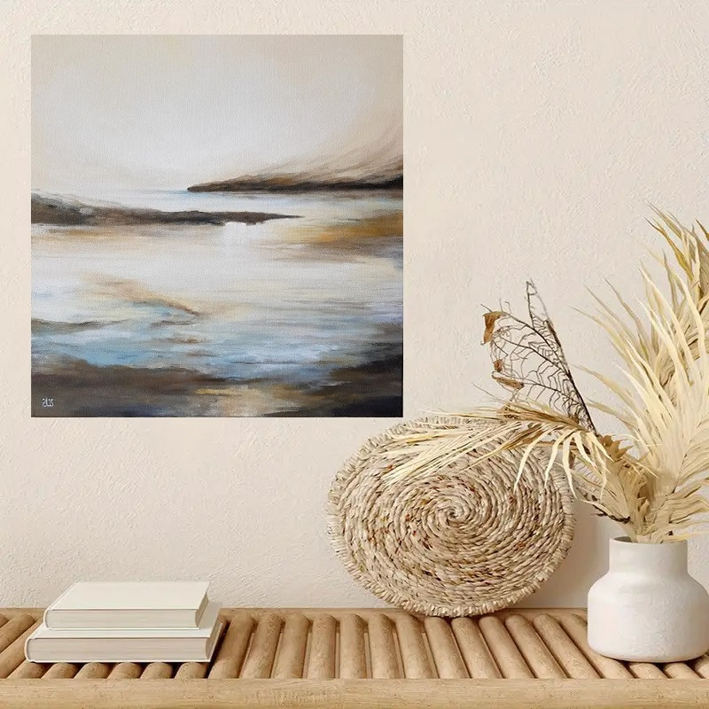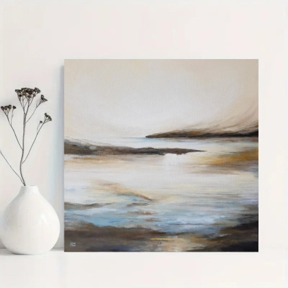 Na obrazie widać spokojny krajobraz, malowany delikatnymi pociągnięciami pędzla. Dominują miękkie odcienie beżu, brązu i błękitu, które subtelnie się przenikają, tworząc harmonijną kompozycję. W centrum rozciąga się lustrzana powierzchnia wody, odbijająca niebo i wzgórza w oddali. Kompozycja zdaje się uchwycać moment ciszy, jakby czas na chwilę zatrzymał się w refleksyjnym blasku światła. Dzieło ma w sobie coś z impresjonizmu, choć artysta zastosował bardziej nowoczesne techniki. Miękkie kontury, pastelowe kolory i delikatne cieniowanie dodają lekkości i elegancji. Obraz emanuje spokojem, wprowadzając widza w stan relaksu. To jakby whisper of serenity, delikatnie szepczący do duszy. Patrząc na obraz, można poczuć powiew świeżego powietrza i usłyszeć śpiew ptaków. Dla siedmiolatka to miejsce, gdzie mieszkają wróżki! Obraz może budzić różne emocje – od zadumy po nostalgiczne wspomnienia lata. Mam wrażenie, że patrząc na to dzieło, każdy znajdzie coś dla siebie, coś magicznego, co przyciąga i skłania do refleksji.