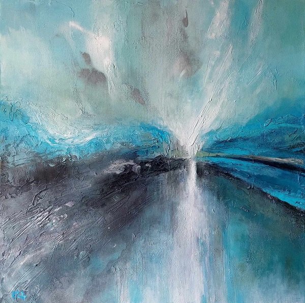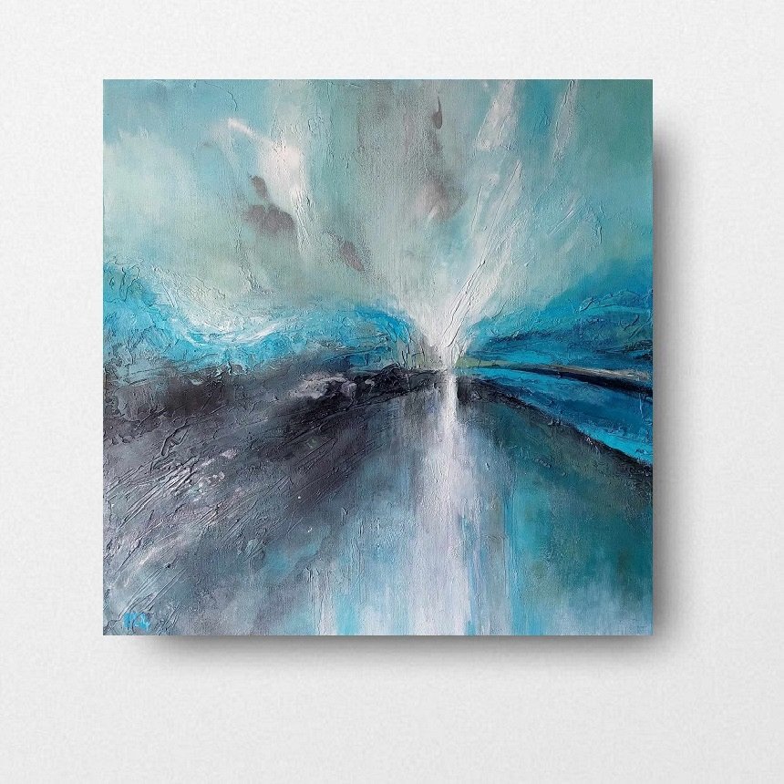 Na obrazie dominują chłodne odcienie błękitu i szarości, przeplecione subtelnością białych przebłysków. Kompozycja zdaje się przyciągać wzrok ku centralnemu punktowi, gdzie kolory się spotykają, tworząc jakby centrum eksplozji energii. Efekt rozmycia dodaje tajemniczości i sprawia, że całość jest oniryczna, jakby wyjęta z marzeń. Wygląda jak zakończone pociągnięcia pędzlem, które tworzą dynamiczne, niemal chaotyczne wzory. Obraz emanuje spokojem z nutą tajemniczości. Wrażenie ruchu i zmienności wywołuje wrażenie, że przyroda żyje własnym rytmem, poza czasem i przestrzenią. Artysta zastosował techniki impastowe, co sprawia, że powierzchnia jest przyjemnie fakturowa. Każdy pociągnięcie pędzla mówi coś innego. Jakiś krzyk, a może szept. Dla mnie to taki "dreamlike" moment, gdzie wszystko się miesza. Gdy patrzę na ten obraz, czuję jakbym był częścią wielkiego wszechświata, w którym wszystko jest możliwe. Mały chłopiec powiedziałby: "To wygląda jak baśniowa kraina, gdzie żyją chmurki i wiatry". Kiedy oglądam to dzieło, mam ochotę się w nim zanurzyć, jakby był to portal do innego świata.