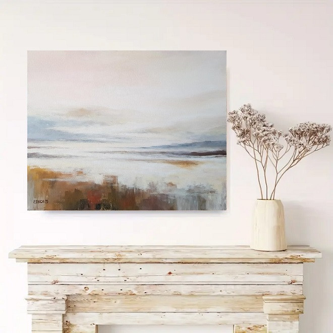 Obraz emanuje delikatnością pastelowych barw, które przenikają się w subtelny sposób. Dominuje tu paleta ciepłych i chłodnych tonacji, harmonizująca przestrzeń między abstrakcyjnymi plamami barw. Na pierwszy rzut oka widać stonowane błękity i szarości, które zderzają się z ciepłymi odcieniami brązu i pomarańczu, jak w przytulnym jesiennym krajobrazie. Kształty na obrazie są zamglone i lekko rozmyte, tworząc wrażenie przestronności i głębi, jakby oddychały. Kompozycja jest pozioma, co dodaje spokoju i równowagi. Atmosfera dzieła jest niezwykle spokojna. Prawie słychać szum wiatru i czuć delikatny zapach morza w powietrzu. To dla mnie moment zatrzymania, kiedy czas na chwilę przestaje istnieć. Styl malowania wydaje się być inspirowany technikami impresjonistycznymi, z naciskiem na ulotność chwili. Artysta zastosował delikatne pociągnięcia pędzla, by oddać lekką mgłę pejzażu. Jest coś magicznego w tej abstrakcyjnej prostocie. Obraz dla mnie jest jak cicha kontemplacja, zmusza do zastanowienia się nad pięknem codzienności i chwil. Może budzić uczucie spokoju, ale też niewielkiego smutku, jakby tęsknoty za chwilą, której już nie ma. Myślę, że każdy widz może dostrzec w nim fragment siebie. Wow, jakie to piękne, pomyśli 7-latek z zachwytem. Chciałbym tam być! Ten pejzaż to prawdziwe 'escape' od miejskiego zgiełku, prowadząc do miejsca, gdzie można na chwilę odpocząć od pośpiechu.