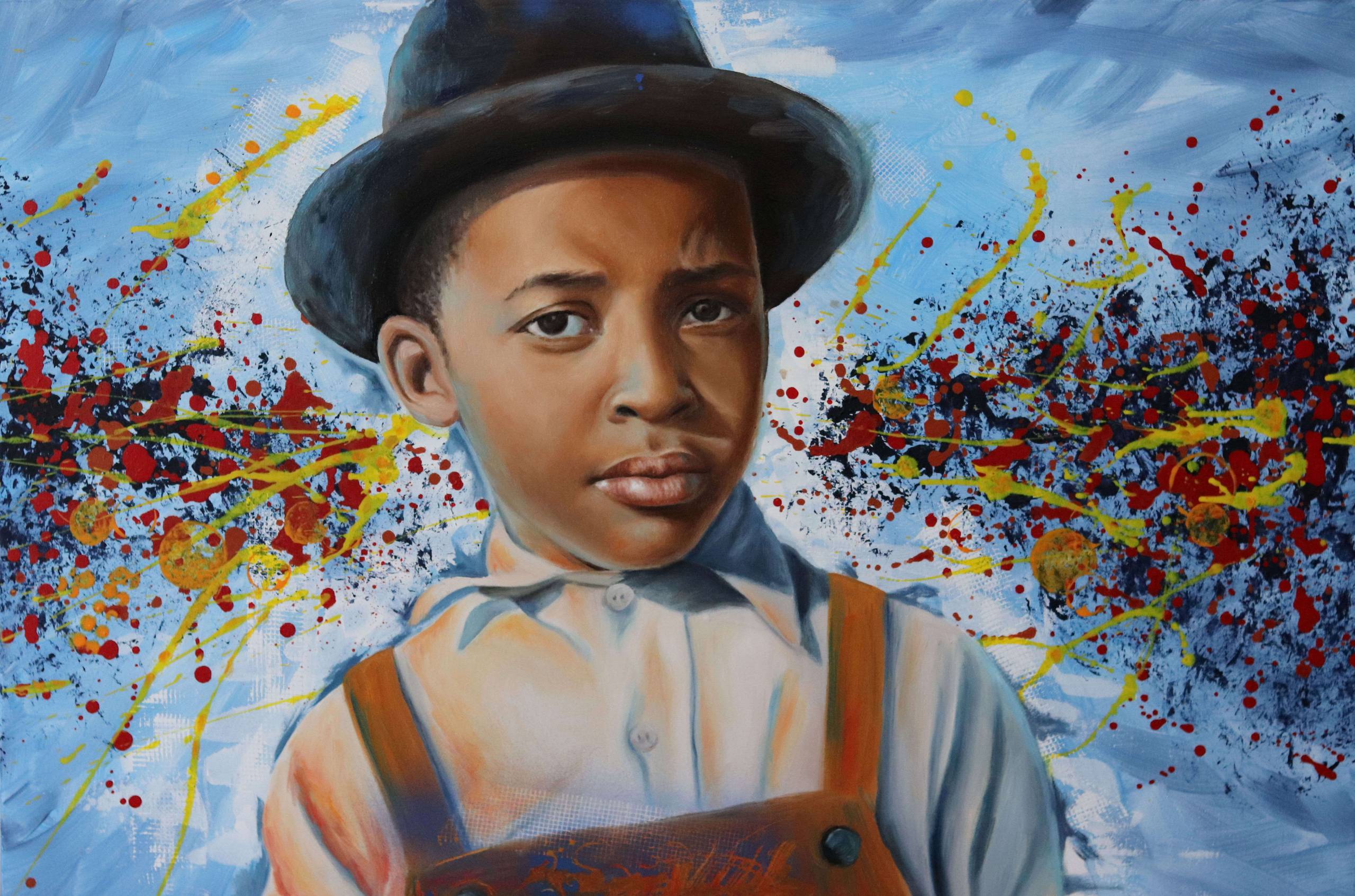 Chłopiec z przeszłości, patrzący z niepewnością i lękiem w przyszłość. Obraz namalowany techniką mieszaną, tło pracy jest akrylową abstrakcją natomiast postać jest przedstawiona w sposób realistyczny techniką olejną. Boki obrazu są zamalowane w kolorze.