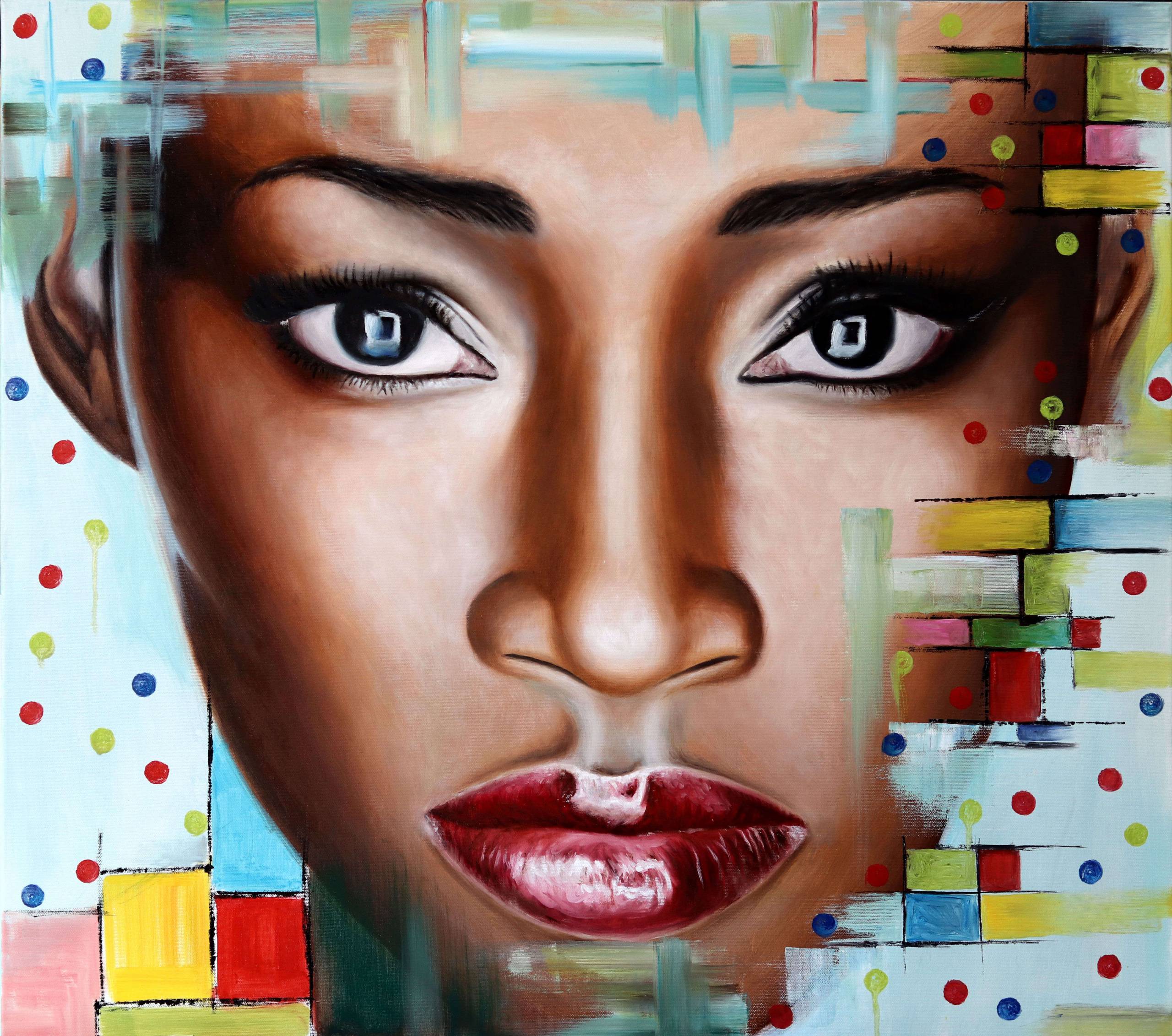 Na obrazie dominuje intensywne spojrzenie, które przyciąga uwagę i hipnotyzuje. Twarz wyróżnia się gładkimi, ciepłymi tonami skóry, które kontrastują z chłodnym błękitem tła. Geometryczne wzory w postaci kolorowych prostokątów i punkty nadają dziełu nowoczesny, dynamiczny look. Nastrój obrazu jest złożony: połączenie intensywnych barw i surowości spojrzenia tworzy aurę tajemnicy i refleksji. Artysta zastosował technikę malarską, która łączy realizm z elementami abstrakcji, co nadaje obrazu unikalnego charakteru. Ciekawe, jak to zrobiliśmy, prawda? Takie połączenie może budzić w odbiorcy poczucie niepokoju, ale też fascynacji. Patrząc na tę twarz, można poczuć się jakbyśmy zaglądali w głąb duszy. Obraz emanuje emocjami, zależy jak na to spojrzeć. Kolory i formy zdają się opowiadać historię – czy to opowieść o poszukiwaniu tożsamości, czy o sile indywidualności? Osobiście czuję tu nutkę buntu i determinacji. To coś, co sprawia, że "wow", naprawdę się zastanawiasz.