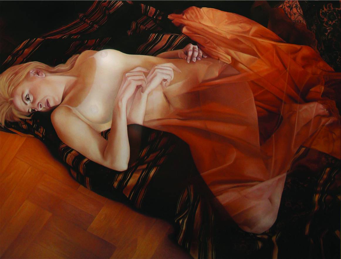 Ten obraz przyciąga wzrok swoją bogatą paletą ciepłych barw i subtelnymi grami światła. Dominuje pomarańczowa pościel, która otula delikatnie postać kobiety, jakby zatrzymując ją w chwili refleksji. Rozłożona na podłodze, otoczona przez ciemne tony, tworzy kontrast z jasnością jej skóry. Kompozycja skłania do zatrzymania się chwilę i zastanowienia. Jest w tym coś spokojnego, a jednocześnie tajemniczego. Atmosfera przywołuje spokój poranka, ale w wietrze unosi się nuta zamyślenia. Kolory są tak nasycone, że wydają się niemal tangible, prawie jakby można było je dotknąć. Technika artysty jest zadziwiająco realistyczna, dająca jednocześnie margines dla interpretacji. Szczególna uwaga poświęcona detalom, takim jak drobne fałdy materiału, tworzy wrażenie głębi i autentyczności. Obraz pobudza zmysły i umysł do rozmyślań o tym, co mogło wydarzyć się przed chwilą. Przykuwa uwagę także delikatne światło, które oświetla twarz kobiety. To jak zasługujący na miano "perfect" moment utrwalony w czasie. Odbiorca może odczuwać spokój, ale i ciekawość. Co ją trapi, co cieszy? Jedno z moich pierwszych wrażeń było pełne zdziwienia. Oczy szeroko otwarte, ukazujące gamę niewypowiedzianych emocji. Jak na mijający sen, obraz ukazuje subtelność, która robi wrażenie. I właściwie nie wiem dlaczego, ale pomyślałam o ciepłym kocu w zimny dzień. Naprawdę można się zagłębić w tę historię ukrytą w przedziale między rzeczywistością a wyobraźnią.