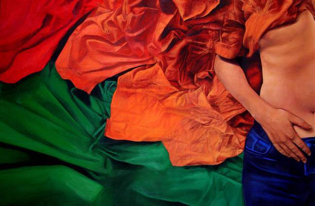Obraz jest wyraźną eksplozją kolorów i emocji. Głębokie zielenie i ciepłe pomarańcze mieszają się, tworząc kontrast, który przyciąga wzrok. Ułożenie tkanin jest niczym fala, falujące zagięcia nadają dynamiki i wrażenie ruchu. Fragment ciała prawie się kryje pośród tych barwnych tkanin, delikatnie odsłonięta skóra wydaje się mówić o intymności i bezbronności. Kompozycja przypomina chaos, lecz jednocześnie wszystko zdaje się być na swoim miejscu w chaotycznym porządku. Widz czuje nutkę tajemniczości i może się zastanawiać, kim jest ta osoba. Styl obrazu to połączenie realizmu z czymś niemal onirycznym. Technika, z jaką artysta oddał fakturę materiałów i subtelność cielesności, zasługuje na podziw. Malarska dbałość o szczegóły jest tu kluczowa. Obraz emanuje spokojną energią, ale i jakąś niepokojącą nutą, może to nostalgia? Jakieś echo wspomnienia? Tych kolorowych, dynamicznych form nie można zapomnieć. Wow, jak u mamy w szafie! To połączenie chaosu i piękna sprawia, że człowiek czuje coś na kształt freedom. Kiedy patrzę na to dzieło, myślę o ulotnych chwilach i emocjach, które często trudno wyrazić słowami.