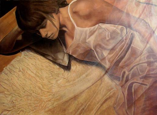 Obraz jest jak cichy, spokojny sen zatrzymany w czasie. Dominuje ciepła paleta kolorów – odcienie brązu, beżu i złamanego bieli tworzą harmonijną kompozycję. Postać kobiety, ułożona na miękkim podłożu, jest centralnym punktem obrazu. Delikatna materia sukienki otacza ją jak mgiełka, z niedbale rozrzuconym materiałem. Jej włosy są ciemne, rzucając cień na twarz. Nasz wzrok przykuwają subtelne kontrasty światła i cienia. Całość ma dreamlike atmosferę. Artysta użył techniki, która przypomina malarstwo impresjonistyczne, choć z bardziej wyraźnymi konturami. Naturalne, płynne ruchy pędzla tworzą iluzję lekkiego wiatru szeleszczącego materiałem. Wywołuje to u widza uczucie spokoju i melancholii, jakby obraz mógł być osobistą refleksją nad minionymi chwilami. Czuję w nim nutę nostalgia. Dzieło to zaprasza do osobistych interpretacji. Może to być moment po zamyśleniu, albo odpoczynku po dniu pełnym emocji. Ciekawy jest ten juxtaposition kobiecej delikatności i surowości otoczenia. Pomyślałem sobie, że to prawie jak prawdziwy snapshot in time. Patrząc na nią, mam wrażenie, że czas stanął, a ja jestem częścią tej intymnej chwili. "Pani jest zmęczona" – powiedziałby 7-latek i miałby rację. Malarz oddaje tę chwilę z wielką precyzją, z nutką tajemnicy. Czy to nie fascynujące, jak sztuka potrafi tak poruszyć wyobraźnię?