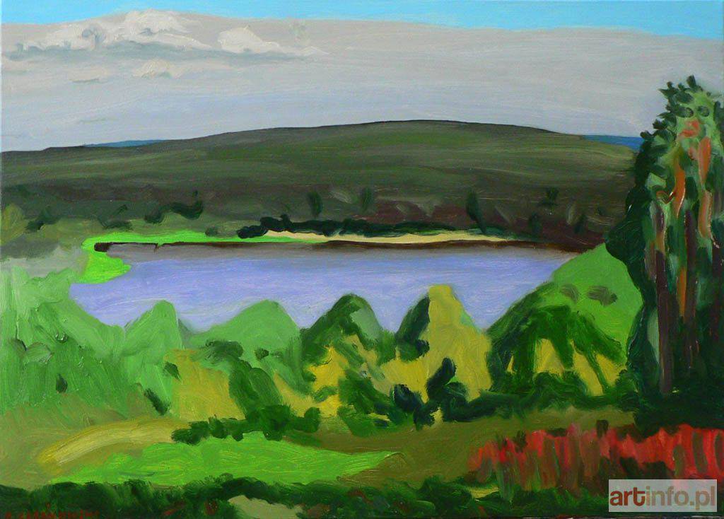 Obraz przedstawia sielankowy krajobraz z dominującymi zieleniami i błękitami. W centralnej części widzimy spokojne jezioro, otoczone przez bujną roślinność. Zieleń kipi energią, rozlewając się po płótnie niczym ink on paper. Niebo zamyka przestrzeń od góry, z delikatnymi chmurami przesuwającymi się leniwie. Kolory są intensywne, jakby artysta chciał nas zaprosić do tego bajkowego świata. Styl obrazu jest wyrazisty, z wyraźnymi pociągnięciami pędzla, co dodaje energii i surowości. Czujesz, jakbyś mógł dotknąć faktury tych soczystych farb. Atmosfera jest spokojna, wręcz idylliczna jak w dniu bez zmartwień. Obraz emanuje harmonią i naturalnym pięknem, które przyciąga i uspokaja. Możesz poczuć się tu jak dziecko biegające po łące. Myślę sobie - jakie to cudne, taki spokój, chciałbym tam być. Małe dziecko powiedziałoby: "O, to jest bajorka, i tam są ogromne drzewa!" Technika jest bardzo wyrazista, z odważnym użyciem koloru i kreatywną kompozycją. Frazes "mniej znaczy więcej" dobrze tu pasuje, bo choć obraz jest prosty, jego emocjonalny przekaz jest głęboki. Refleksja? Natura jest najpiękniej namalowaną sztuką, a ten obraz to przypomina w każdej linii, w każdym kolorze.