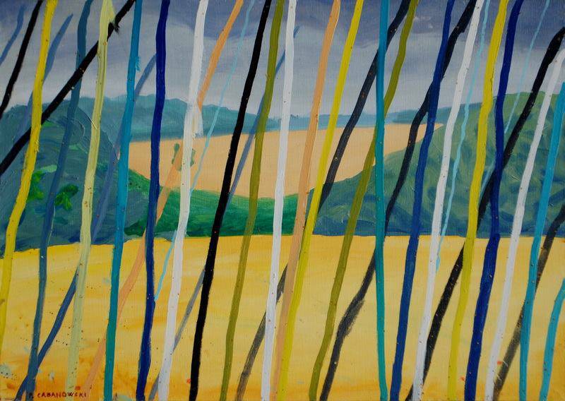 Obraz zdaje się być połączeniem krajobrazu i abstrakcji, prezentując żywe kolory, które mieszają się ze sobą w harmonijny sposób. Widzimy żółć złocistego pola, które kontrastuje z ciemnymi, pionowymi liniami. Czy to tancerze w deszczu czy może drzewa w wietrze? Who knows! Tło jest stonowane, z zielonymi wzgórzami wirującymi w oddali pod niebem pokrytym delikatnymi chmurami. Artysta zdecydował się na odważne, ekspresyjne użycie pędzla, co nadaje pracy dynamiczności i energii. Można niemal poczuć rytm, jakby obraz muzyką był spleciony. I wtedy myśl sobie: "Chciałbym tam być!" Technika jest ciekawa, mieszając modernistyczne podejście z subtelnym naturalizmem. Emocje są intensywne, wywołują poczucie spokoju, ale i tajemniczości. Czujesz, jakbyś patrzył na coś znajomego, a jednocześnie zupełnie nowego. Ciekawe, że tak proste formy potrafią budować bogaty świat wyobraźni, prawda? Ten obraz jest jak nieskończona opowieść, którą każde dziecko mogłoby opisać jednym zdaniem: „To tak wygląda jak las w czasie burzy z kolorowymi liniami.”