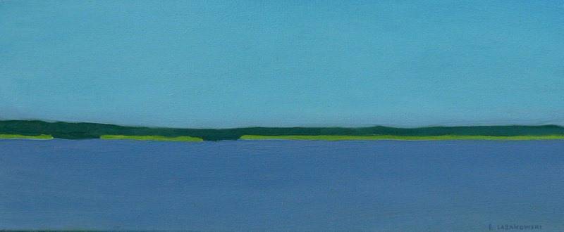 Patrząc na ten obraz, od razu czuć spokój i błogość. Dominują tutaj odcienie niebieskiego i zielonego, tworząc z harmonijną kompozycję, która przypomina krajobraz z nadmorskim horyzontem. Płaska linia zieleni oddziela lazur nieba od nieco ciemniejszego błękitu wody, nadając scenie minimalistyczny charakter. Artysta posługuje się delikatnym pociągnięciem pędzla, które sprawia, że wszystko wydaje się miękkie i subtelne, trochę jak w marzeniach sennych. Atmosfera jest niezwykle relaksująca, jakby na chwilę czas zwolnił i wszystko wokół zamilkło. Wyobrażam sobie, że to taki moment, kiedy siadasz na brzegu cichego jeziora, czując tylko delikatny powiew wiatru. Obraz ten wydaje się być przykładem sztuki abstrakcyjnej, gdzie prostota formy jest kluczem do zrozumienia piękna. To prawie jak "less is more". Dla mnie ten obraz emanuje spokojem, ale też pewnym rodzajem tajemniczości. Dlaczego tu tak cicho? Może to miejsce do przemyśleń albo po prostu chwila na złapanie oddechu. Jak napisałoby 7-letnie dziecko: "niebo jest duże, a woda błyszczy". Obraz sprawia, że czuję się zrelaksowany, a jednocześnie zachęca do refleksji nad prostotą piękna natury.