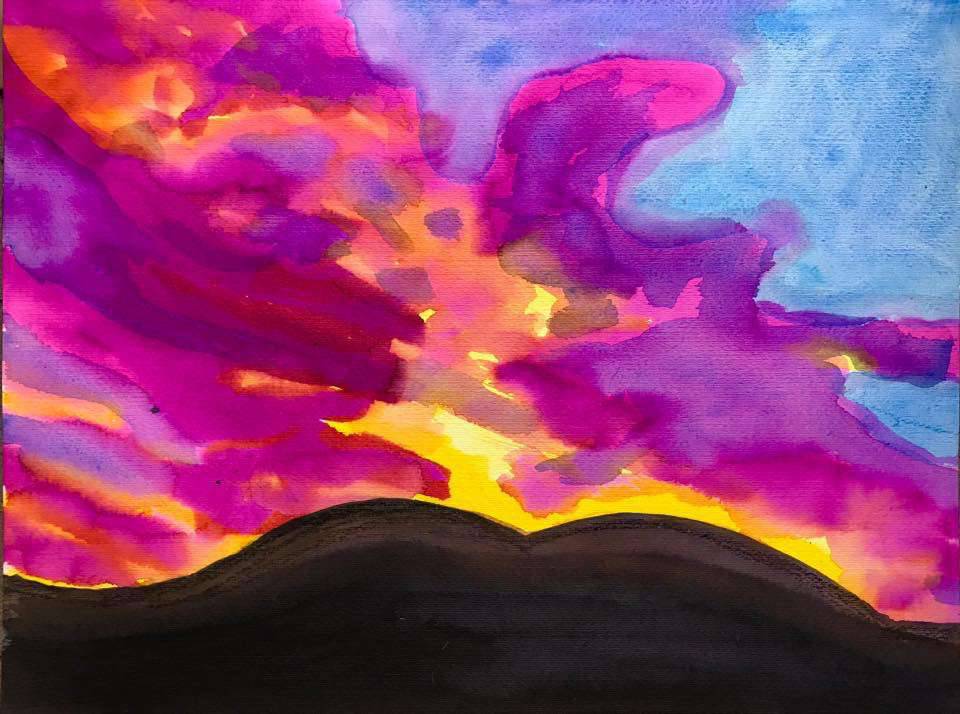Obraz jest eksplozją kolorów. Różowe, pomarańczowe i fioletowe chmury płynnie mieszają się na błękitnym niebie, tworząc istną feerię barw. U dołu kompozycji czarna, falująca linia przypomina horyzont, powściągliwy kontrast dla jaskrawej gamy kolorystycznej powyżej. Czuć tu dynamizm, niemal słyszy się szum wiatru szepczącego w powietrzu. Atmosfera obrazu jest jednocześnie spokojna i pełna przepychu. Tak jakby ten moment był uchwyceniem magicznej chwili przed zapadnięciem zmroku. Artysta zastosował technikę akwareli, co dodaje całości lekkości. Rozmyte krawędzie i płynne przejścia kolorów tworzą efekt magiczny. Dla mnie obraz ten jest synonimem wolności. Jakby natura mówiła: spójrz, jakie cuda tworzę o zmierzchu. Dziecko by pewnie powiedziało: "A ja widzę tęczę!" Ten artystyczny "sunset" może prowokować refleksję i zachwyt. Można patrzeć na ten obraz i poczuć się małym elementem wszechświata. Jego piękno przytłacza i inspiruje, zmusza do zatrzymania się na chwilę i podziwu. Dzięki temu obraz wywołuje emocje i porusza do głębi serca.