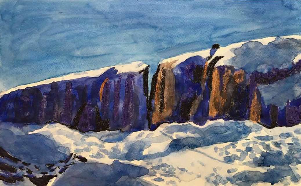 Na obrazie dominują zimne, niebieskie i białe barwy, które tworzą surowy krajobraz górski. Kształty są nieregularne, a kolory przenikają się płynnie, tworząc wrażenie dynamiki. Artysta zastosował technikę akwareli, co dodaje delikatności i subtelności kompozycji. Całość emanuje spokojem i chłodem górskiego powietrza, choć intensywne odcienie niebieskiego i fioletu ożywiają krajobraz, nadając mu nieco dramatyzmu. Patrząc na obraz, można poczuć się tak, jakby się stało na skraju lodowca, gdzie wiatr śpiewa swoją własną melodię. Mnóstwo detali nadaje pracy realistycznego wymiaru, a jednak sposób ich przedstawienia pozwala widzowi na własną interpretację. Wow! Dzieło zdaje się mówić: "spójrz na mnie i poczuj majestat natury". I ja myślę sobie, że mogłoby być tak na prawdę zimno. Przyjrzyjmy się, jak malowane były poszczególne elementy: widać pewną nonszalancję, może nawet lekki chaos, który jednak doskonale oddaje nieprzewidywalność przyrody. Jest w tym coś magicznego i jednocześnie nieuchwytnego. Jeden, mały błysk pomarańczu tu i ówdzie, jak delikatny płomień, dodaje ciepła i kontrastuje z chłodnym tłem. To taka mała iskierka nadziei w zimowym krajobrazie. A może po prostu świetlny efekt słońca odbitego od lodu? Who knows?