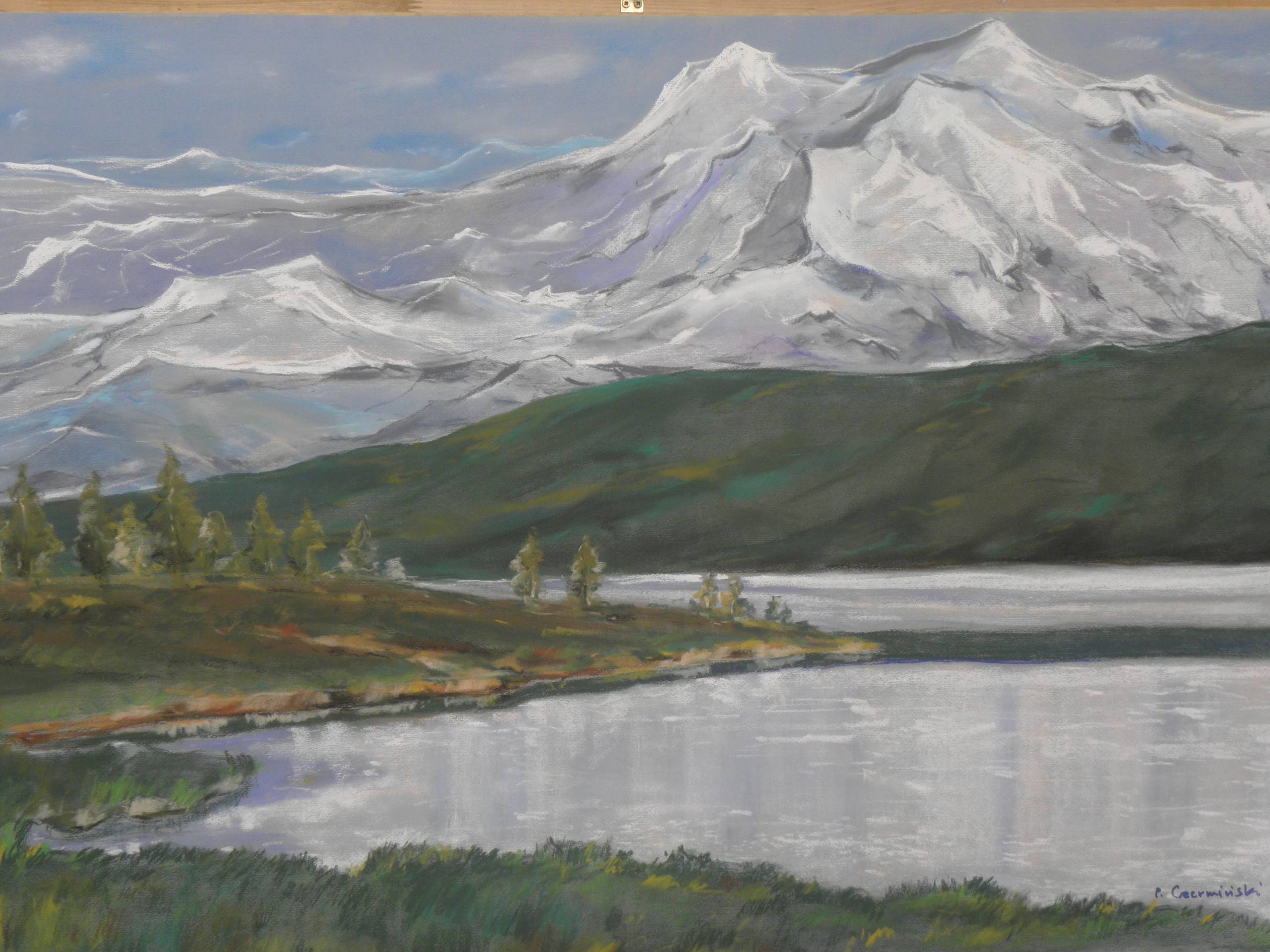 Obraz przedstawia majestatyczne góry ośnieżone bielą, kontrastujące z głęboką zielenią doliny. Warstwy chmur delikatnie przysłaniają szczyty, nadając im tajemniczości. Spokojne jezioro odbija górską panoramę, tworząc harmonię. Światło i cień subtelnie modelują formy, uwypuklając kształty gór. Widok przyciąga wzrok, a człowiek od razu czuje się jak hipnotyzowany tą spokojną sceną. Atmosfera obrazu emanuje ciszą i spokojem, ale też chłodem i majestatem natury. Artysta zastosował technikę impasto, gdzie grube pociągnięcia pędzla dodają tekstury. Użycie pastelowych tonów podkreśla delikatność krajobrazu. Patrząc na to dzieło, można poczuć zapach świeżości i chłód wiatru. Dla dziecka ten obraz to po prostu wielkie góry i woda, która chyba jest zimna. Moje myśli błądzą, przypominając mi o wakacjach w górach, gdzie czas płynie inaczej. Kolorystyka i sposób oddania przestrzeni sprawiają, że odnosi się wrażenie bycia tam "live". Ten obraz wywołuje spokojny zachwyt i skłania do refleksji nad pięknem natury.