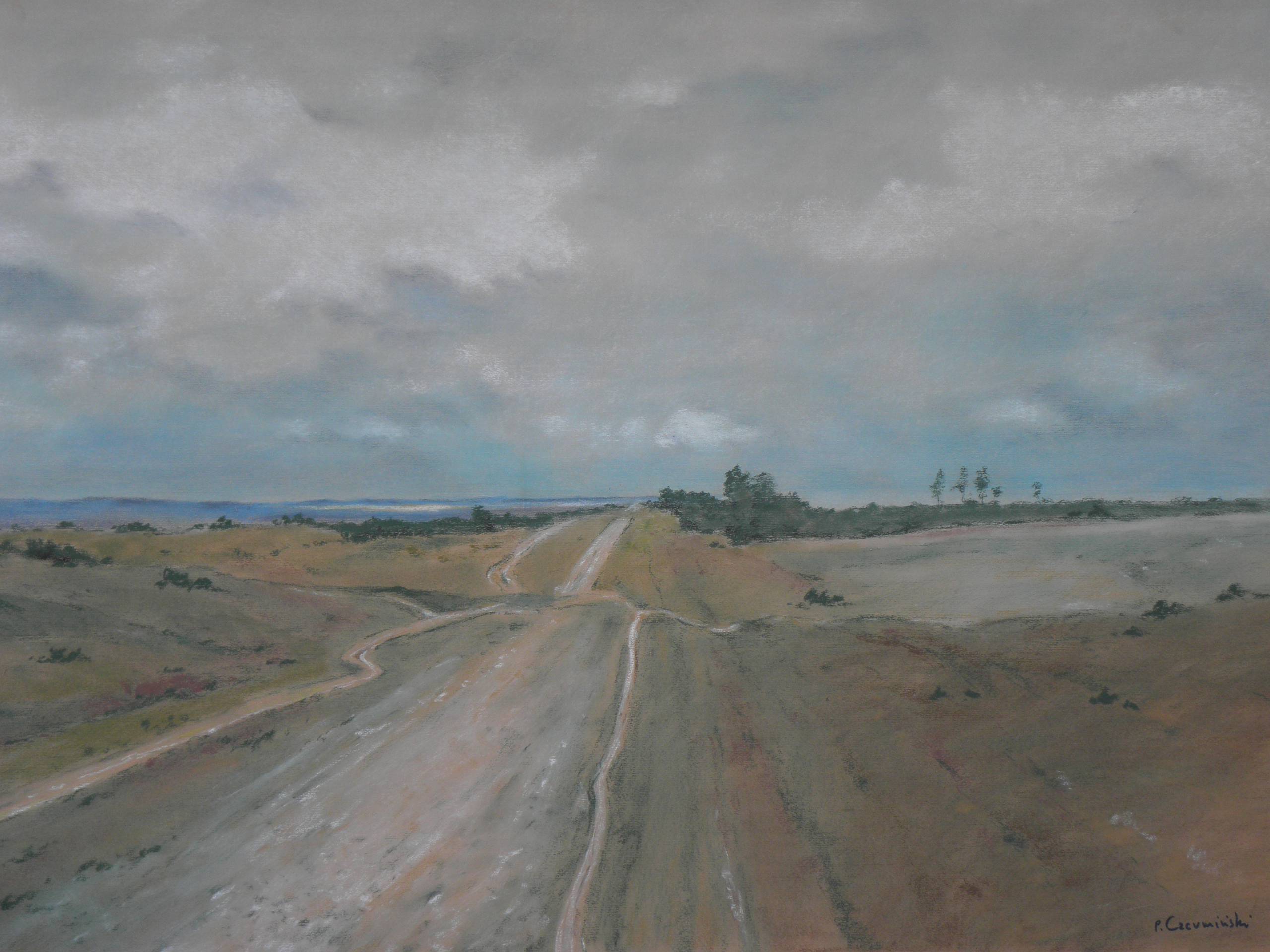 Obraz przedstawia rozległy krajobraz z drogą przedzierającą się przez pofałdowane wzgórza. Dominują stonowane barwy: szare niebo kontrastuje z brązowo-zielonymi polami. Horyzont wydaje się nieskończony, a pojedyncze drzewa dodają uroku tej surowej przestrzeni. Kompozycja jest wyważona, z centralnie usytuowaną drogą, która prowadzi oko widza ku dalekiemu horyzontowi. Artysta sięgnął po technikę malowania z miękkimi przejściami między kolorami, co nadaje obrazowi delikatności i subtelnej elegancji. Atmosfera emanuje spokojem, wręcz melancholią, jakby czas zwolnił. Patrząc na obraz, człowiek potrafi się zrelaksować, uciec myślami w te odległe pola. Czuję się, jakbym tam był, wdychał świeże powietrze. Czy widzisz te małe chmurki? Dziecko powiedziałoby: "To jak wata cukrowa!" Obraz może wywoływać uczucie tęsknoty za naturą, za prostotą. Trochę jak nostalgiczna podróż do przeszłości. Gdy się w niego wpatruję, przypomina mi się letnia wycieczka, driving through the countryside, w poszukiwaniu spokoju. Właśnie takie emocje we mnie wywołuje - spokój i refleksja.