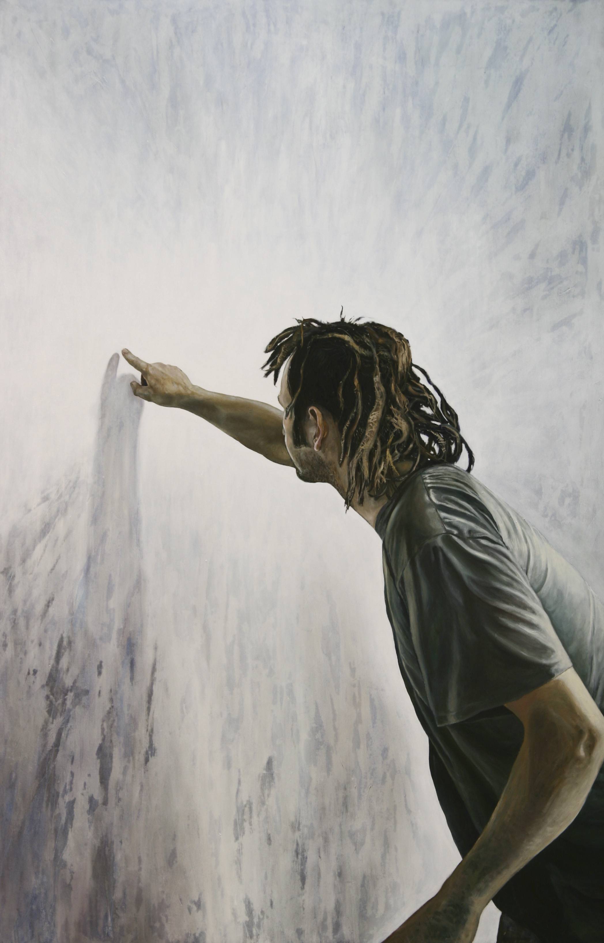 Obraz przedstawia mężczyznę o jasnej karnacji, z dredami, który delikatnie dotyka białej, niemal eterycznej ściany. Kompozycja jest dość minimalistyczna, dominują odcienie bieli i szarości, co nadaje dziełu pewną tajemniczość. Czuje się jakby ten punkt był magic. Przestrzeń wokół zdaje się być nieskończona, co sprawia, że postać wygląda jakby znajdowała się na progu innego wymiaru. Styl artysty oscyluje pomiędzy realizmem a surrealizmem, gdzie szczegółowość postaci kontrastuje z abstrakcyjnym tłem. Technika malarska sugeruje precyzyjne pociągnięcia pędzla oraz subtelne przejścia tonalne. Patrząc na ten obraz, można odczuć mieszankę ciekawości i niepokoju – co kryje się za tą ścianą? Czy to tylko marzenie? Obraz działa na wyobraźnię, budzi refleksje o granicach rzeczywistości i naszej percepcji. Może nawet wywołać uśmiech, bo kto z nas, jako dziecko, nie zastanawiał się, co dzieje się po drugiej stronie świata? Naprawdę mind-blowing jest to, jak prostota obrazu przeobraża się w głęboki przekaz.