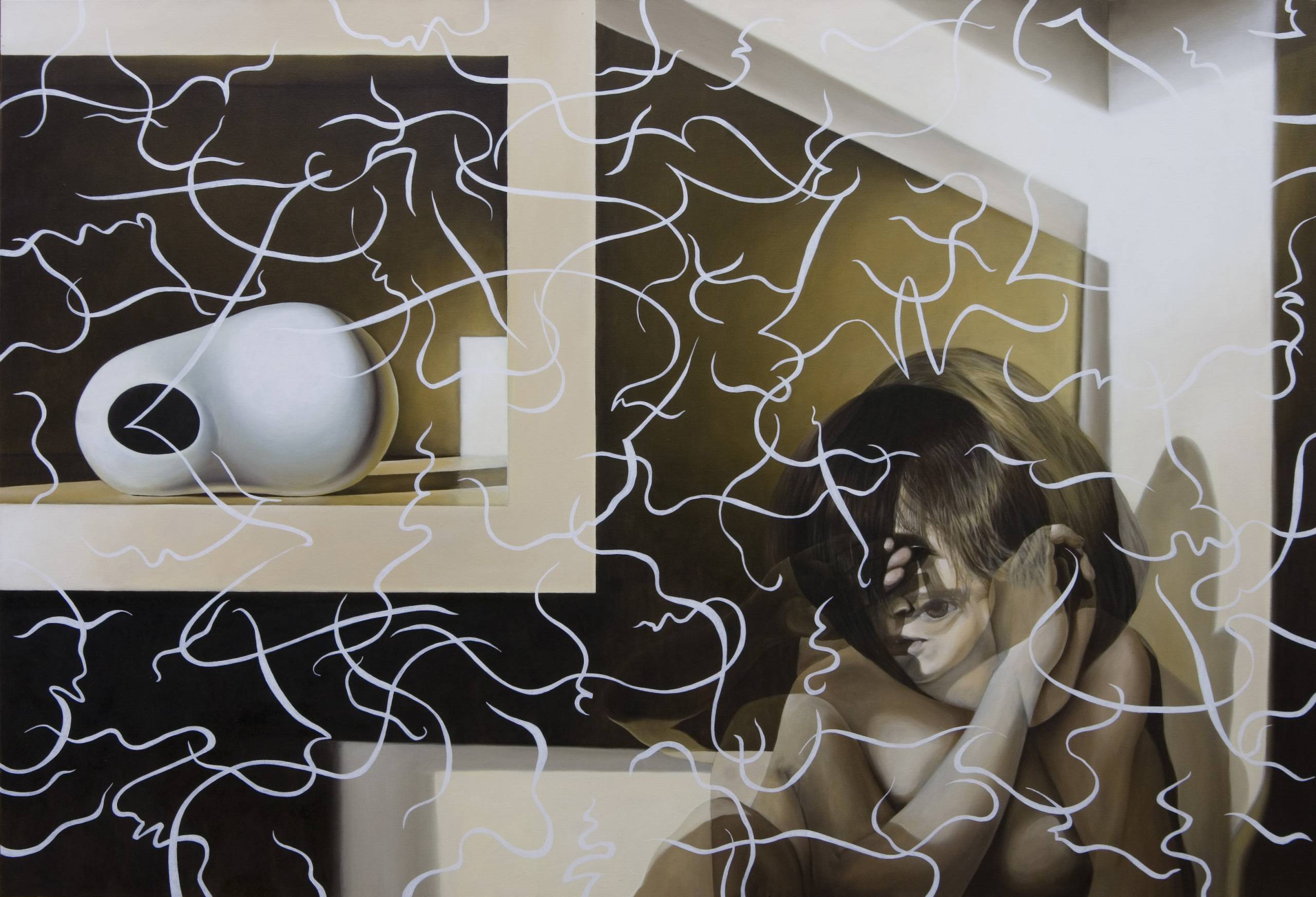 Obraz przyciąga wzrok intrygującą mieszanką form i kolorów. Kolory są stonowane, z przewagą brązów, beży i delikatnych bieli, które doskonale współgrają z bardziej abstrakcyjnymi kształtami. Centralny motyw to postać złożona jakby z kawałków, otoczona wirującymi liniami, które przypominają tańczące, niemal żyjące pociągnięcia pędzla. To jeden z tych obrazów, które można interpretować na wiele sposobów; czuć tu pewnego rodzaju melancholię i zagubienie, ale też ciekawość i poszukiwanie. A może nawet trochę tajemnicy? Styl artysty łączy realizm z elementami abstrakcji. Techniczne wykonanie jest bardzo precyzyjne, widać dbałość o detal, ale linie wydają się być namalowane z pasją. Można by powiedzieć, że obraz krzyczy "look at me!", próbując przyciągnąć naszą uwagę swoim chaosem i porządkiem jednocześnie. Nastrój dzieła wprowadza widza w swoisty taniec emocji, od zamyślenia po zdziwienie. Dla 7-letniego dziecka obraz mógłby wyglądać jak dziwny sen, gdzie kolory i kształty bawią się w berka. Moim zdaniem, dzieło to ma moc skłonienia do refleksji o ludzkiej naturze. Co artysta chciał nam przez to powiedzieć? Może każdy z nas jest takim złożonym labiryntem, gdzie linie reprezentują nasze myśli i uczucia?