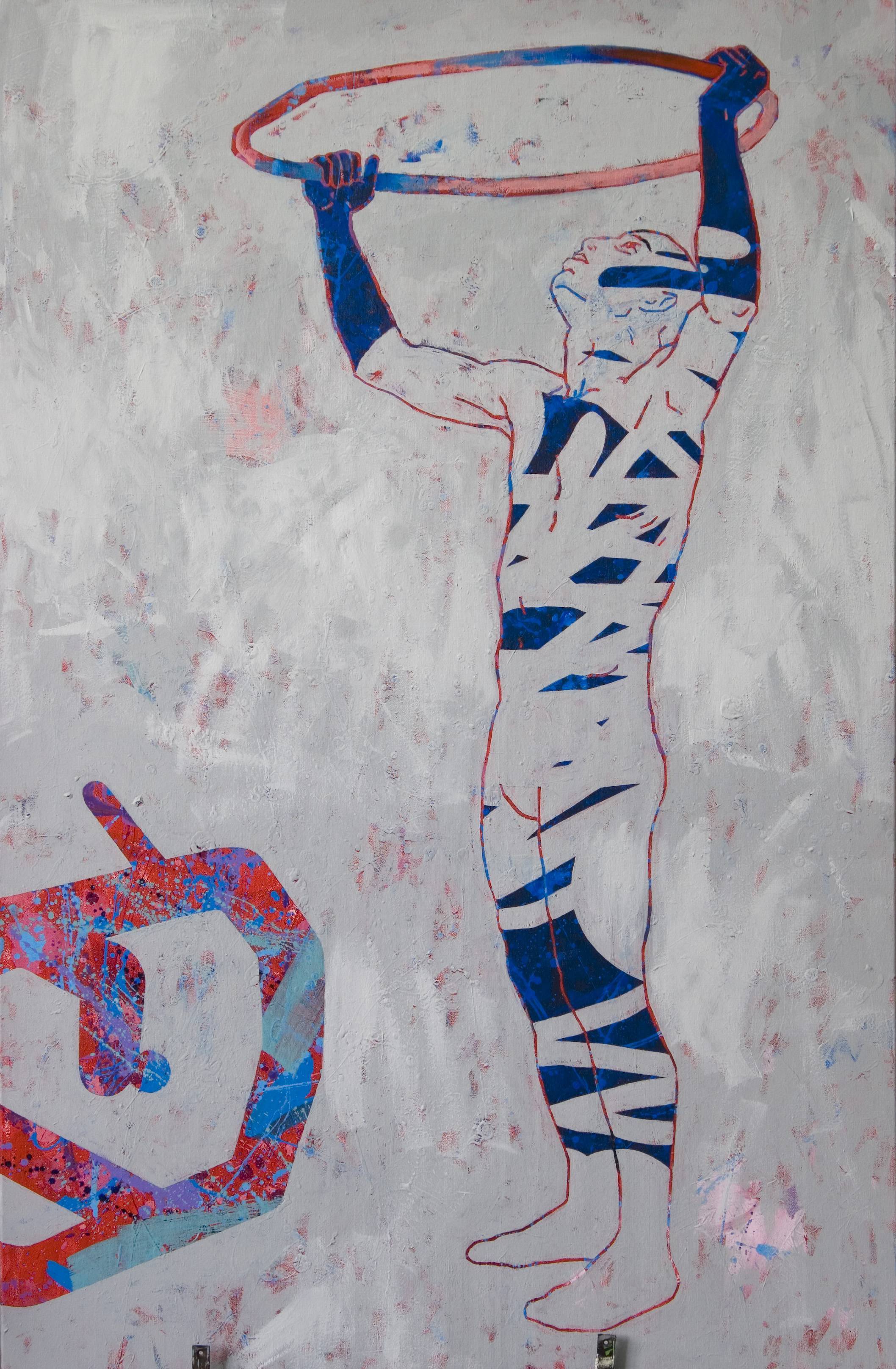 Obraz przedstawia postać trzymającą w rękach duży obręcz, unosząc go wysoko nad głową. Dominują chłodne, niebieskie i czerwone odcienie, które kontrastują z białym tłem. Kompozycja jest dynamiczna, z wyraźnymi liniami i geometrycznym układem na ciele, które sugerują ruch i siłę. Nastrój dzieła jest pełen energii, jakby figura była w trakcie pokonywania jakiegoś wyzwania. Może przypominać o sile ludzkiej determinacji. Artysta zastosował technikę mieszania barw, które przenikają się i tworzą efekt warstw. Ma się wrażenie, jakby cienkie pociągnięcia pędzla tworzyły niemal ruchomą strukturę. Może to budzić skojarzenia z tańcem lub akrobatyką. Patrzę na to i czuję jakby coś mnie poruszało. Czy to radość z ruchu czy może nostalgia? Mój synek powiedziałby: "To ktoś robi magię!". No i coś w tym jest. Dzieło nie tylko przyciąga wzrok, ale też sprawia, że zastanawiam się nad znaczeniem wolności i siły. A przecież czasem takie "big" rzeczy z małych momentów wynikają, prawda? Obraz jest fascynujący, bo łączy w sobie prostotę formy z bogactwem barw i emocji. Może być odczytywany jako symbol przemiany, momentu, kiedy coś nowego się zaczyna. Przypomina mi się cytat o przekraczaniu granic i odkrywaniu siebie na nowo.