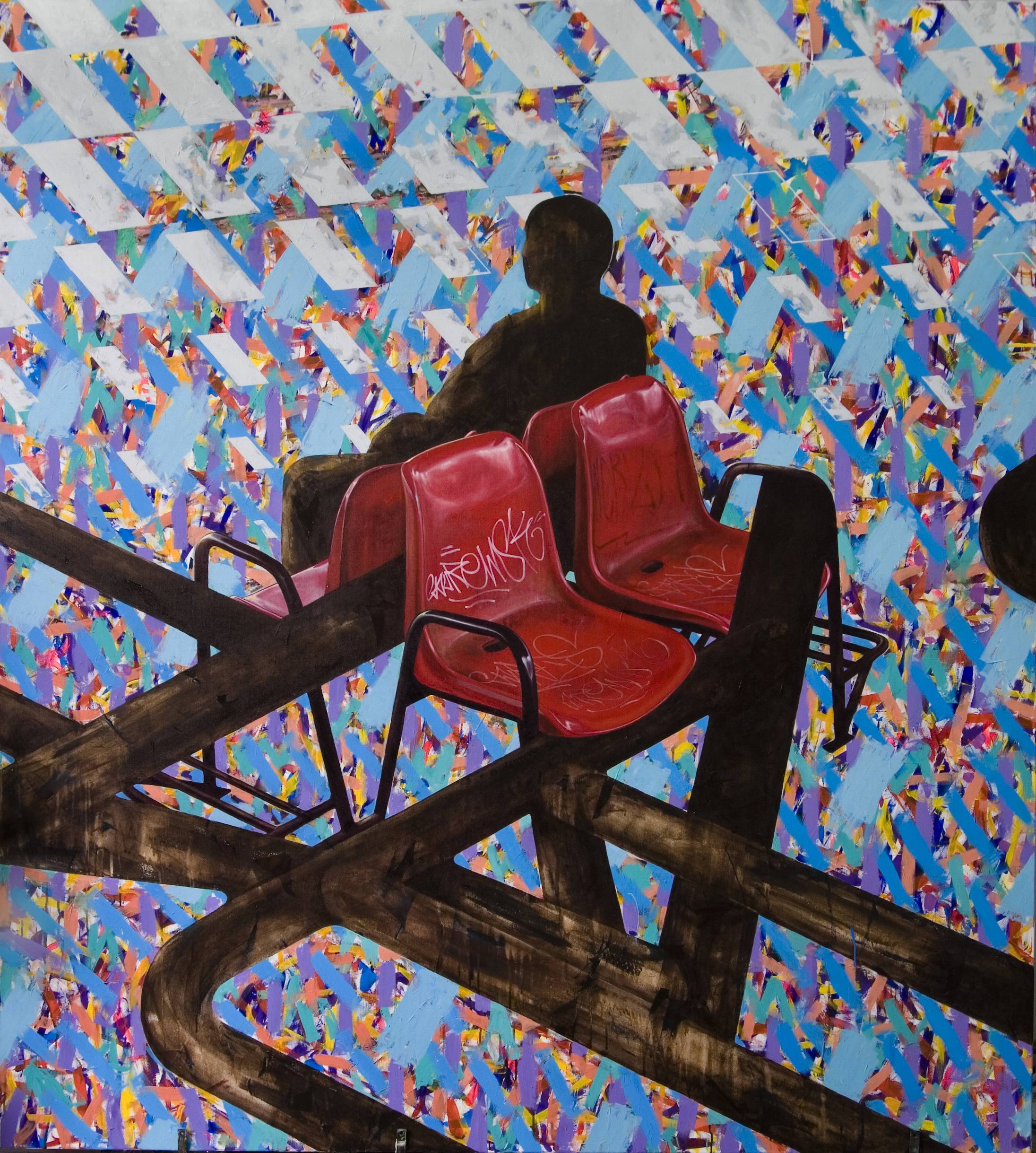 Obraz ten to istny kalejdoskop barw i kształtów. W centrum widzimy rząd czerwonych krzeseł, które przyciągają wzrok dzięki swojej intensywnej barwie, kontrastując z jaskrawym, nieco chaotycznym tłem pełnym plam błękitu, pomarańczu i różu. Kompozycja jest jakby wyrwana z podmiejskiego krajobrazu, gdzie graffiti zdobi zakątki, nadając im nowoczesny charakter. Artysta wykorzystuje elementy street artu, co dodaje dziełu dynamizmu. Atmosfera wydaje się zarazem statyczna i pełna ruchu, co wprowadza pewien rodzaj napięcia. Obraz przykuwa uwagę swoją nieokreśloną melancholią, jak samotni przechodnie w miejskiej dżungli. Czuć tutaj „something missing”, pewną pustkę, mimo żywej kolorystyki. Techniki malarskie, z wyraźnie widocznymi pociągnięciami pędzla, podkreślają artystyczne niedoskonałości, co tylko dodaje realizmu. Obserwując, można poczuć pewien dyskomfort, a może nawet nostalgiczny powrót do wspomnień z młodości. Dla mnie całość niby szepce o samotności. Tło przypomina mi plac zabaw, na którym nikt nie bawi się już w berka. Jak mawiałby 7-letni maluch: „Krzesełka czekają na przyjaciół!”. Czy nie jest to zaskakujące, jak mocno sztuka potrafi grać na naszych emocjach, przywołując wspomnienia i pytania? Ma w sobie coś magicznego, co sprawia, że chcemy przyjrzeć się bliżej.