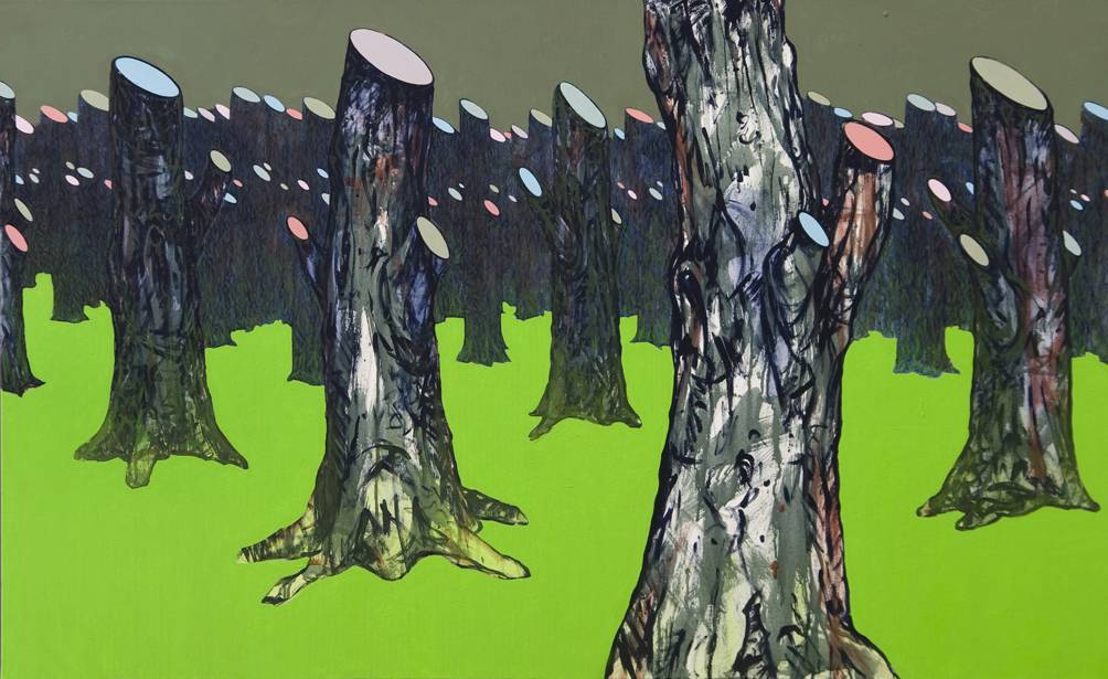 Obraz przedstawia las pełen pni drzew, które wydają się zostały świeżo ścięte. Tło mieniące się zielenią podkreśla ciemne, gradientowe pnie, z jasnymi, pastelowymi przekrojami na ich szczytach. Ta kontrastowa kompozycja tworzy wrażenie pewnej surowości i zaniku życiowej energii. Gdy patrzy się na tę kompozycję, atmosfera wydaje się być nieco niepokojąca. Las bez liści, martwy, pusty wręcz, emanuje poczuciem utraty i przemijania. To prawdziwy wake-up call dla tych, którzy nie dostrzegają znaczenia przyrody w codziennym życiu. Artysta użył wyraźnego stylu, łączącego elementy realizmu z odrobiną abstrakcji. Technika może przypominać cyfrowe malarstwo lub precyzyjną akrylę, pozwalającą na uzyskanie nieskalanych linii i odważnych barw. Każdy pień jest jednocześnie podobny i wyjątkowy, tworząc swoisty rytm. Ten obraz mógłby wzbudzić emocje smutku, ale również refleksji nad losem naszego świata. Uczucie izolacji i pustki nasuwa myśli o odpowiedzialności za środowisko. Pomyślałem, że może to miejsce, gdzie las marzył o swojej dawnej świetności. A może to tak, jakby drzewa mówiły: „Hej, where did everyone go?”. Całość skłania do zatrzymania się na chwilę i osobistej refleksji, przywołując wspomnienia z dzieciństwa, kiedy lasy były pełne życia, a nie ścięte na pniaki.
