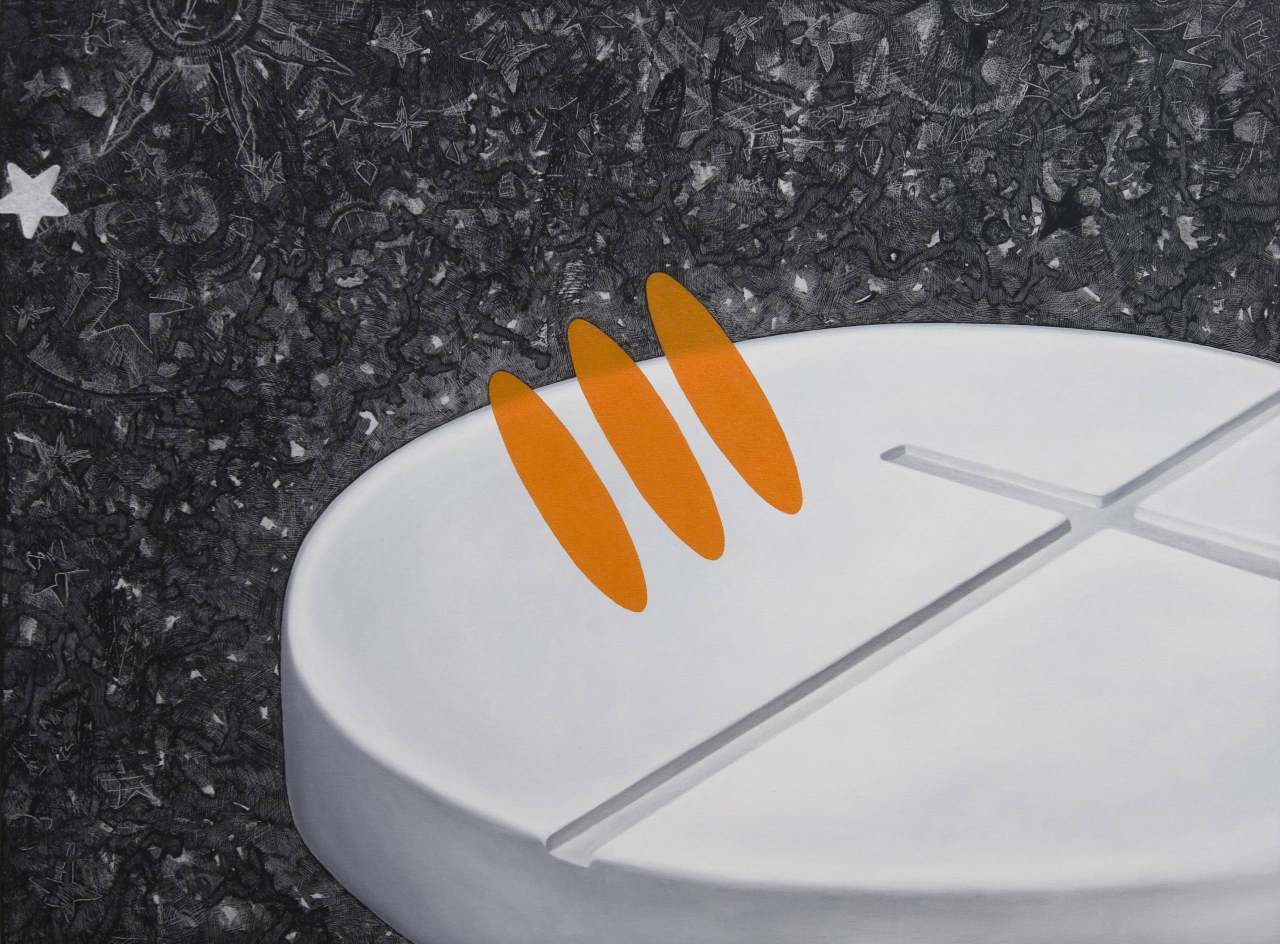 Obraz przyciąga wzrok dynamiczną kompozycją i kontrastującymi kolorami. Tło to czarna przestrzeń wypełniona chaotycznymi wzorami przypominającymi niebo pełne gwiazd. Na jego tle wybija się duża, biała forma przypominająca talerz, z wyraźnym, krzyżowym wgłębieniem. Na pierwszy plan wysuwają się trzy intensywne, pomarańczowe elipsy, które jakby unoszą się nad białą powierzchnią. Atmosfera dzieła jest tajemnicza, trochę surrealistyczna. Artysta zastosował technikę mieszania płaskiego koloru z detalami o szorstkiej fakturze, co dodaje pracy głębi. Styl malarski zaskakuje swoją prostotą, ale i umiejętnym wykorzystaniem przestrzeni. Elementy obrazu wywołują różnorodne emocje – od zaciekawienia po lekkie zdumienie. Można dostrzec pewną grę z percepcją, gdzie elementy zawieszone w przestrzeni mogą symbolizować coś nieuchwytnego. Wow, to wygląda jak UFO! Artysta bawi się formą i przestrzenią, co prowokuje do własnych interpretacji. Każdy może znaleźć tu coś własnego, coś wyjątkowego. Ten obraz to prawdziwy mix simplicity i complexity, który intryguje i wciąga widza.