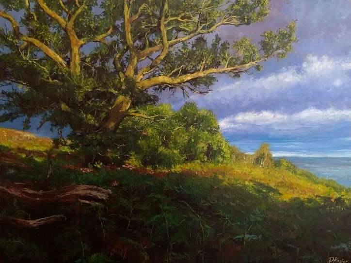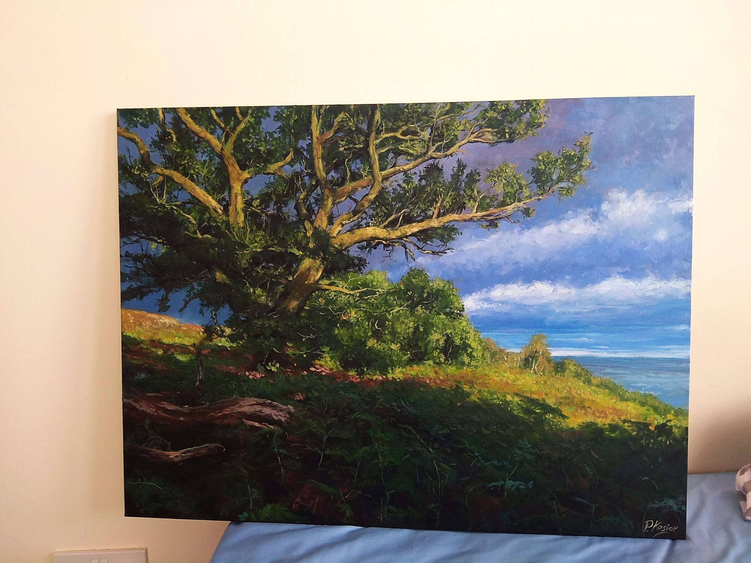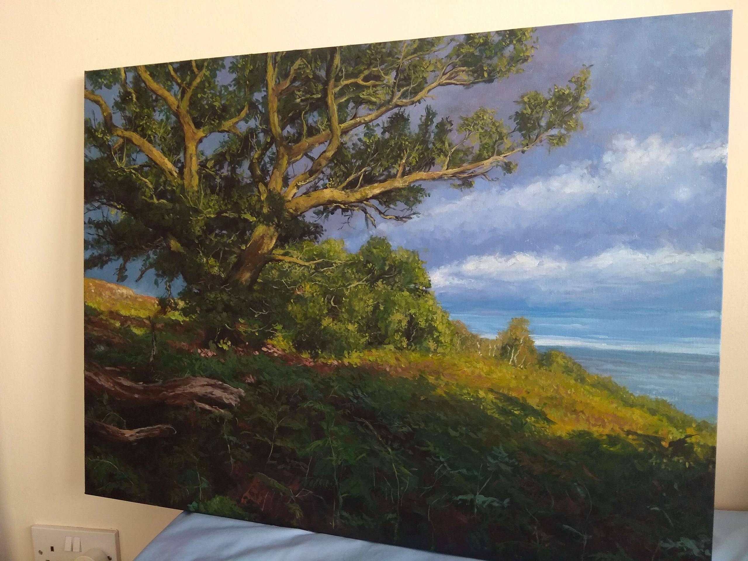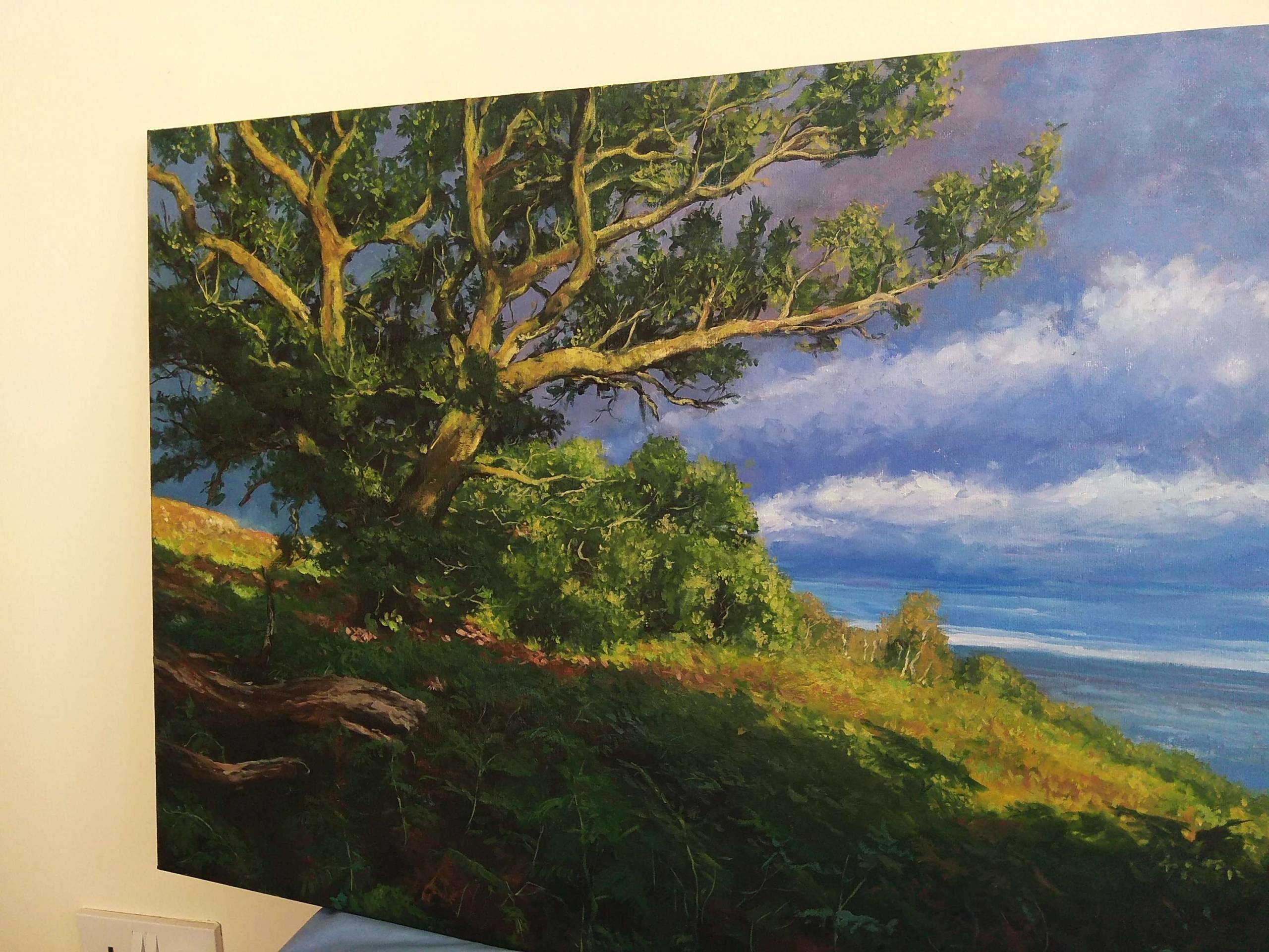 Ten obraz to prawdziwy delight dla oka. Centralnym punktem jest majestatyczne drzewo, którego gałęzie rozciągają się z rozmachem na tle nieba. Kolory są żywe – zielone liście kontrastują z błękitem nieba, gdzieniegdzie przerwanego puszystymi, białymi chmurami. W tle widać spokojne morze, dodające całości przestrzeni i głębi. Atmosfera dzieła jest sielska i uspokajająca. Czujesz, jakbyś stał na wzgórzu w ciepły, letni dzień. Taki widok mógłby wywołać zachwyt nawet u największych sceptyków natury. Aż chce się tam być, usiąść pod drzewem i nic nie robić. Artysta zastosował szerokie pociągnięcia pędzla, co nadało obrazowi teksturę i dynamikę. Technika impresjonistyczna, z domieszką realizmu, ożywia scenę i pozwala odbiorcy poczuć się częścią krajobrazu. Dla mnie, to trochę jak sielanka z dzieciństwa. "Było tam tak zielono, jak u babci w ogródku!" – powiedziałoby dziecko. Całość emanuje spokojem i daje poczucie bezpieczeństwa. Możesz prawie poczuć zapach trawy i usłyszeć szum liści. Ten obraz to mały fragment raju na ziemi.