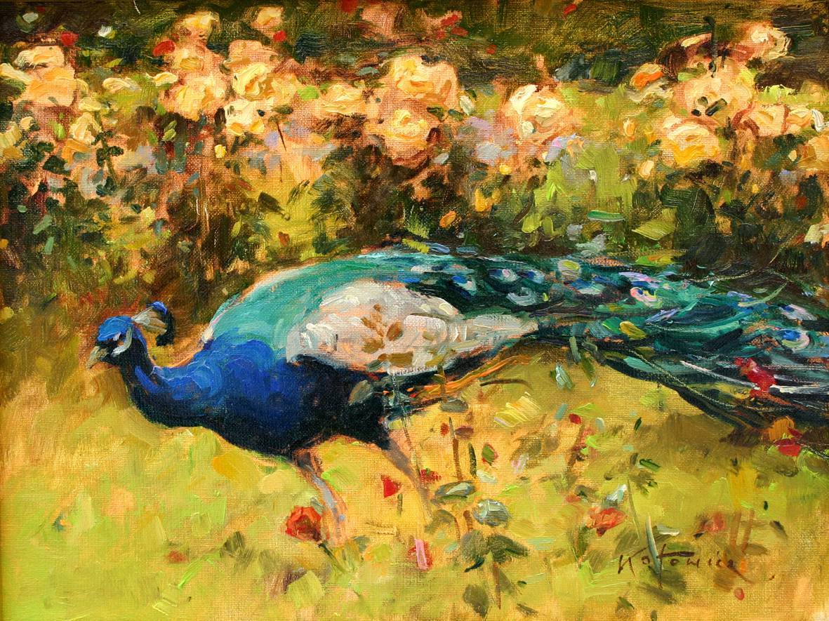 Na obrazie widzimy pięknego pawia, który dumnie spaceruje po ogrodzie pełnym róż. Intensywność kolorów przyciąga wzrok – głęboki błękit piór pawia kontrastuje z delikatnym pastelowym różem kwiatów. Kompozycja wydaje się być spontaniczna, jakby artysta uchwycił chwilowy moment w chaosie barw. Atmosfera jest pełna spokoju i elegancji, ale z nutką tajemnicy, jakbyśmy wkradli się do sekretnego ogrodu. Styl artysty przypomina impresjonizm, z widocznymi pociągnięciami pędzla, które nadają dziełu dynamizmu. Czuć ruch, jakby paw zaraz miał się poruszyć. Cała ta scena mówi do mnie "escape" – chwila oderwania od codzienności. Obraz wywołuje u mnie radość i pewne zaciekawienie, jakby pyta: co tu robi ten paw i dokąd zmierza? Moje dziecko powiedziałoby, że ten ptak to król wszystkich kolorów! Odbiorca może poczuć się zauroczony tym baśniowym ogrodem. Każdy kwiat i każde pióro zdają się mieć swoją historię, zapisaną w wirze farb. Nieformalność takich pociągnięć nadaje obrazowi świeżości i energii, która aż kipie z każdej części płótna.