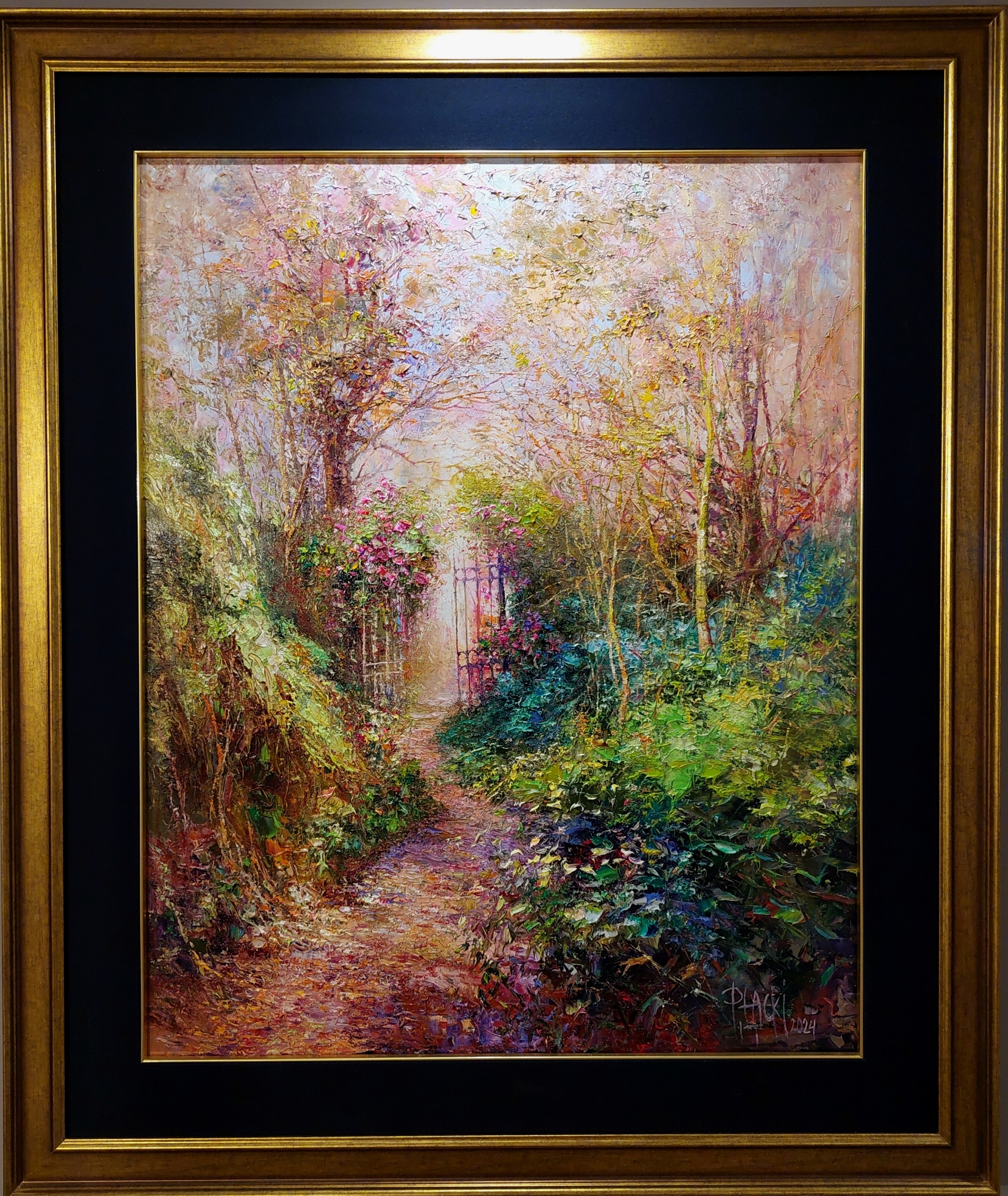 To malowidło pełne jest bujnych kolorów i delikatnych pociągnięć pędzla, które tworzą obraz tajemniczego ogrodu. Dominuje tu zieleń w różnych odcieniach, od głębokiego szmaragdu po pastelową zieleń, schludnie przeplecioną różowym blaskiem kwitnących kwiatów. Centralna ścieżka prowadzi widza w głąb obrazu, do skrytych w mgle tajemnic. A tam na końcu, subtelna brama, niczym portal do innego świata. Tu jest jak w bajce, poważnie, aż chce się wejść i zobaczyć, co jest dalej. Artysta używa techniki impasto, nadając powierzchni strukturalną głębię. Ktokolwiek to malował, wie co robi – layer po layerze, czuje się to. Światło miękko rozprasza się wśród liści, tworząc atmosferę spokoju i nostalgii. Uff, człowiek aż się rozmarzy. Styl przypomina impresjonizm, z naciskiem na ulotne chwile i wrażenia. Ta kompozycja może budzić w odbiorcy poczucie tęsknoty za utraconym rajem czy dzieciństwem. Pełen harmonii, ten obraz to feast for the senses. Mała dziewczynka mogła by powiedzieć: "Ciekawe, czy tam są wróżki!" To miejsce, gdzie by się odpoczęło, przemyślało to i owo. Obraz emanuje dziwną magią, której trudno się oprzeć.