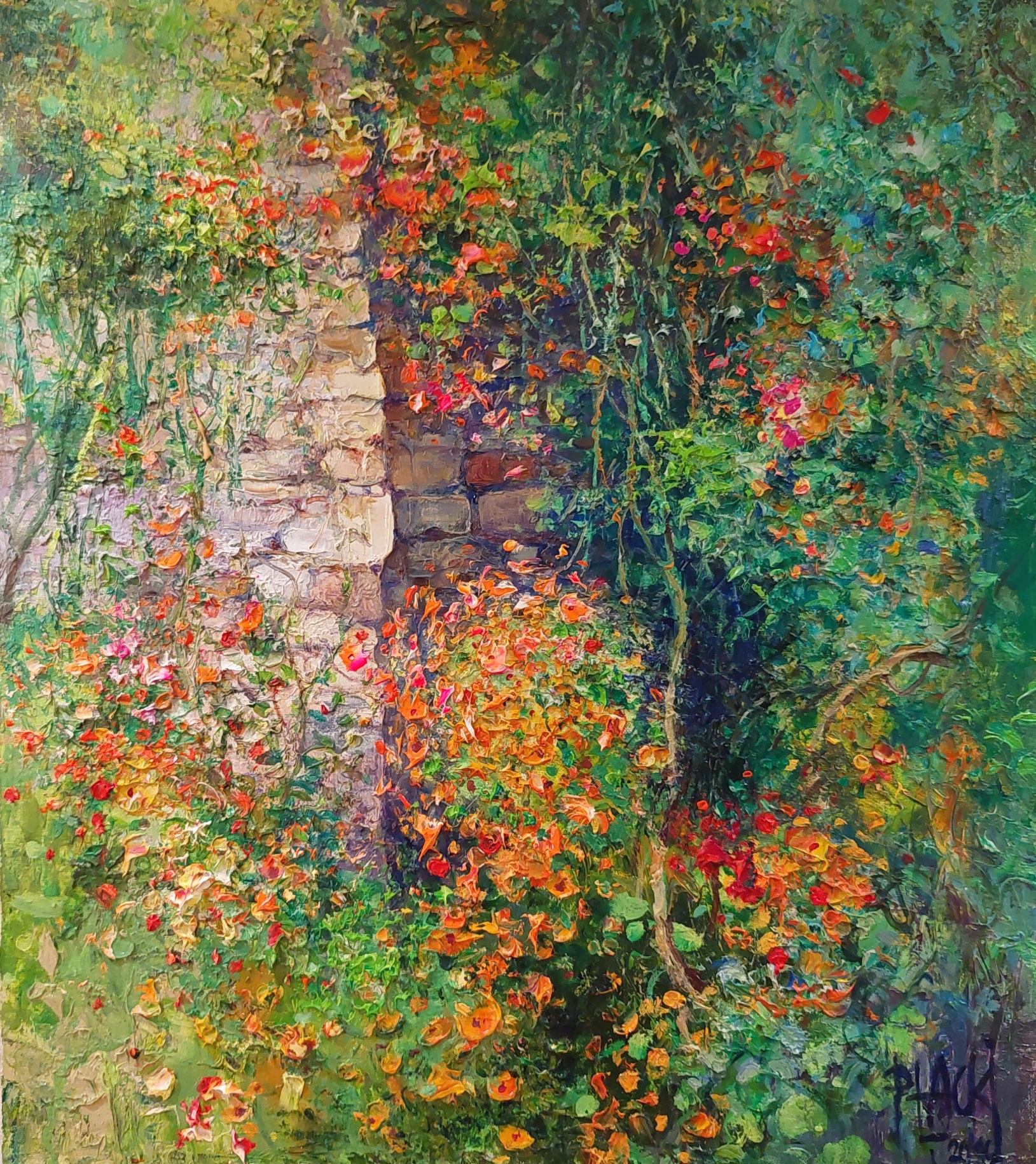 Obraz jest pełen intensywnych kolorów i harmonicznej kompozycji, gdzie zieleń przeplata się z płomiennymi pomarańczami i czerwieniami. Te jaskrawe barwy roztaczają się wokół starego muru, który wprowadza element nostalgii i tajemnicy. Kompozycja wydaje się być chaotyczna, a mimo to przemyślana, z fałszywym nieładem pędzących pnączy zatapiających całą przestrzeń. Malarskie pociągnięcia są pewne, grubo nakładany impast nadaje temu dziełu trójwymiarowości, niemal czujesz, jakbyś mógł dotknąć tych liści. Totalny vibe romantycznej tajemnicy, like, totalnie! Patrząc na ten obraz, można poczuć, jak czas zwalnia, jakby świat na chwilę zwolnił w swojej bieganinie. Nastrój jest spokojny, ale pełen życia, przypomina letnie popołudnia spędzane w ogrodzie. To dzieło wywołuje uczucia szczęścia i kontemplacyjne zadumanie. Każdy z nas mógłby dostrzec w nim coś innego, jedni zobaczą spokój natury, inni może ukrytą tajemnicę za murami. Technicznie, artysta wykorzystał bogactwo faktur i barw, co wskazuje na pewną spontaniczność i artystyczną odwagę. To obraz, który łatwo powoduje uśmiech i odkrywanie w sobie wewnętrznego dziecka, krzyczącego: "O, patrz, jak kolorowo!". Fascynuje swoją prostotą i złożonością jednocześnie. Zaprawdę, kawał dobrej sztuki, który inspiruje i bawi zarazem.
