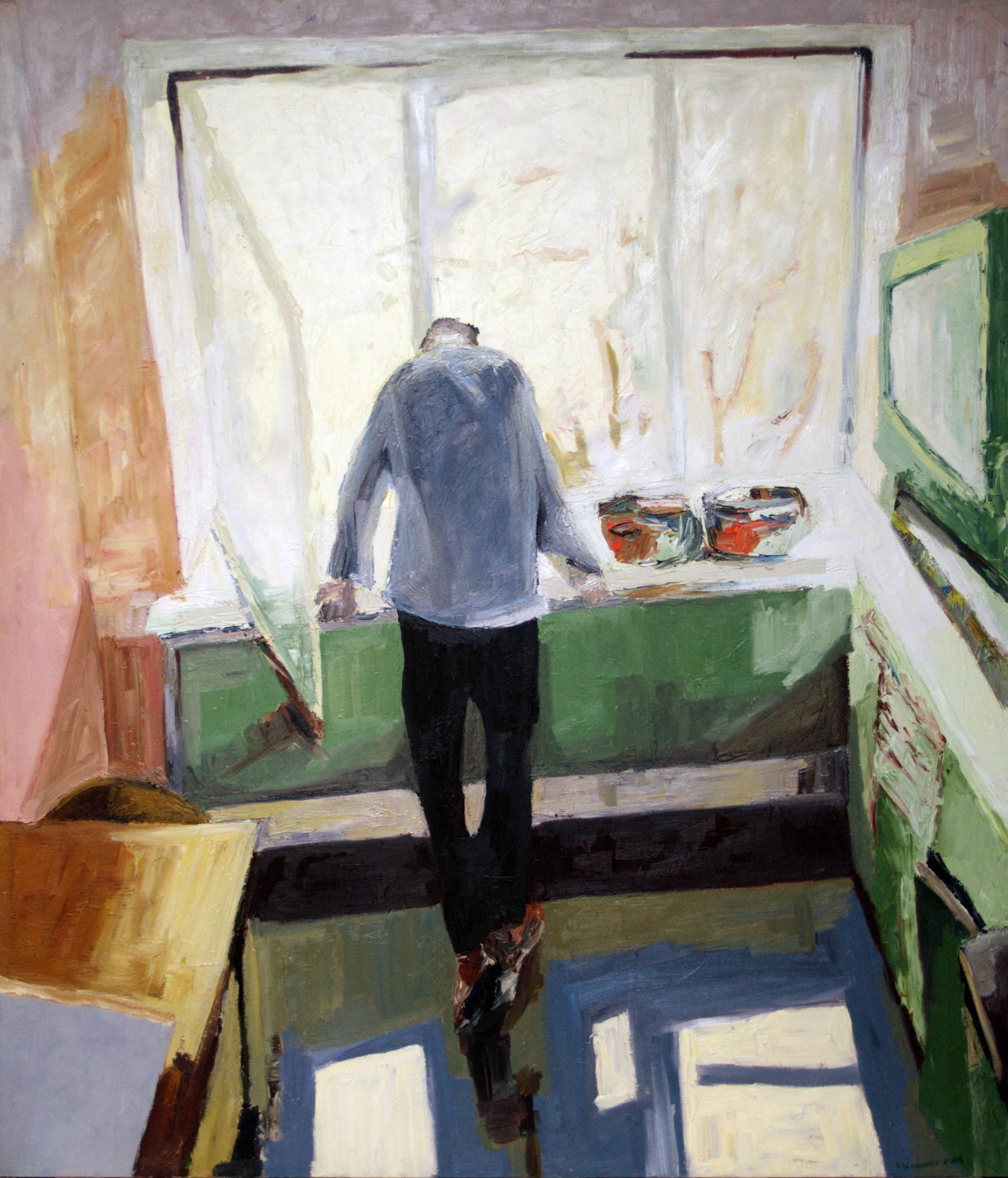 Obraz przedstawia wnętrze pokoju, skąpane w miękkim świetle padającym przez okno. Dominują stonowane kolory: pastelowy róż, złamany zieleń i cieńsze odcienie szarości. Centralną postacią jest osoba stojąca przy oknie, wpatrzona w zewnątrz, jakby szukała odpowiedzi na pytania życia. Jej głowa jest nieco pochylona, a światło obrysowuje jej sylwetkę, tworząc nastrój refleksji i izolacji. Czy to kuchnia, czy warsztat – trudno powiedzieć. Na blacie stoją miski, wypełniają przestrzeń i dodają domowego ciepła. Styl malarski jest impresjonistyczno-nowoczesny, z wyraźnymi, szerokimi pociągnięciami pędzla. Kolory mieszają się ze sobą, tworząc jednocześnie kontrast i harmonię. Jest tu coś magic in the air, jakby artysta chciał uchwycić ulotną chwilę. Dzieło wywołuje poczucie spokoju i zamyślenia. Ktoś mógłby poczuć melancholię, ale i nadzieję płynącą z rozświetlonego okna. Choć forma jest prosta, obraz niesie głęboki przekaz. Czas jakby zwolnił. Patrząc na ten obraz, można się zamyślić nad swoją codziennością i przemijaniem chwil. Proste, a zarazem głębokie – jak codzienna chwila, gdy patrzymy przez okno, nie wiedząc dokładnie, czego szukamy. A obraz mówi do mnie jak stary przyjaciel, z którym można pomilczeć. "Ojeju, ale duże to okno!", mogłoby powiedzieć dziecko, zauważając potęgę światła.