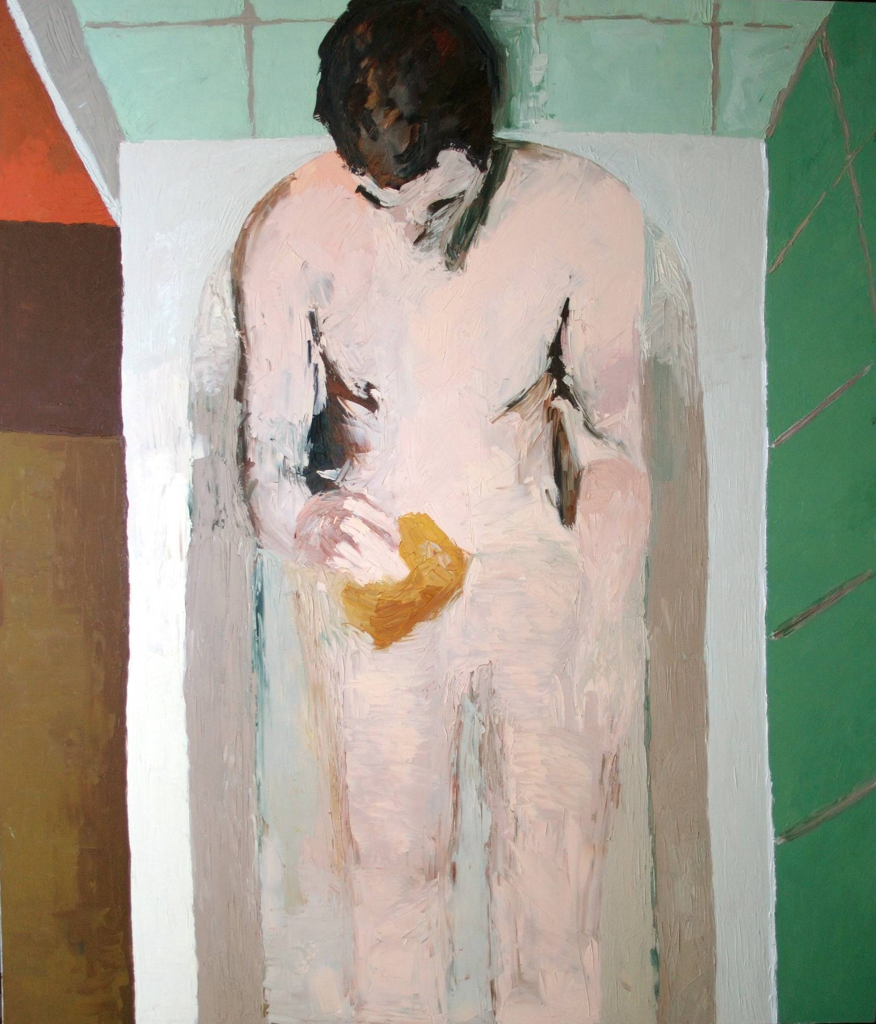 Obraz przedstawia osobę w wannie, namalowaną w sposób ekspresyjny i pełen emocji. Dominują tu delikatne, pastelowe barwy - zielenie, brązy i beże, które tworzą spokojną, intymną atmosferę. Postać jest przedstawiona z góry, jakby widziana z perspektywy ptaka. Taki kadr nadaje pracy ciekawy twist, a uczucie izolacji i zamyślenia niemal wyskakuje z płótna. Tekstura farby zdradza użycie techniki impasto, co dodaje obrazowi dodatkowej warstwy głębi. Trochę jakby ktoś mógł dotknąć, poczuć i usłyszeć tę atmosferę. Rysunek, choć prosty, emanuje złożonymi emocjami. Może to być refleksja nad codzienną chwilą spokoju, moment prywatności, który jest jednocześnie uniwersalny i indywidualny. Dla dziecka powiedziałbym, że wygląda to, jakby ktoś brał prysznic w wannie, ale nie do końca, bo każdy pędzel pociąga za sobą myśl. Obraz przyciąga uwagę, wprawiając w stan zadumy - to jest właśnie ten magiczny element tego art work. Całość wywołuje uczucie nostalgii i refleksji, prowokując pytania o nasze własne intymne chwile samotności. Może to być taki moment zatrzymania, który skłania do myślenia. To jakby kawałek codzienności przetworzony przez sztukę, pokazujący, że prostota kryje w sobie niezwykłą głębię.