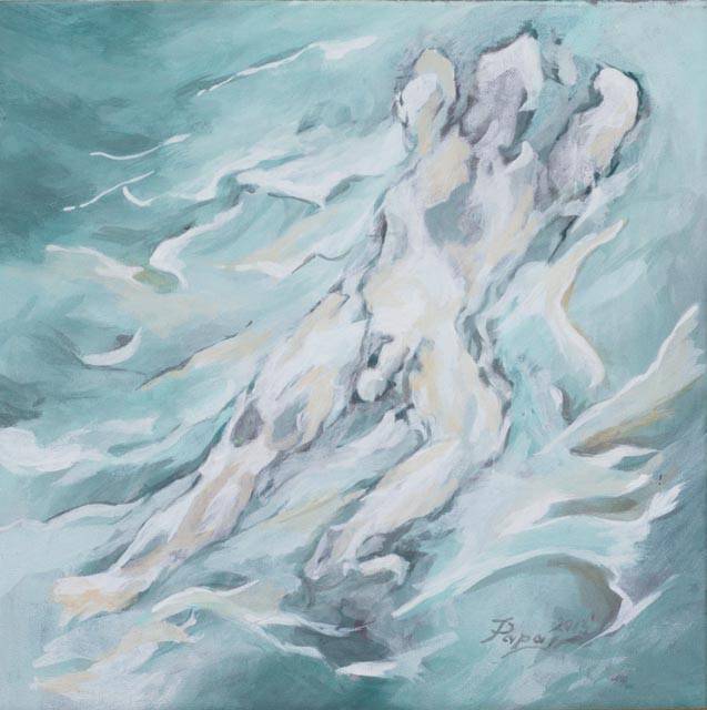 Obraz przyciąga wzrok delikatnymi odcieniami błękitu i bieli, tworząc kompozycję pełną ruchu i dynamiki. Postać ulotnie dryfuje, zlewając się z falami wody, jakby była jej integralną częścią. Rozmazane kształty i kolory przypominają senne wizje. Atmosfera obrazu jest pełna spokoju, a jednocześnie jakiegoś nieokreślonego napięcia, które sprawia, że chce się na niego patrzeć jeszcze dłużej. To jak uczucie, kiedy siedzisz na brzegu morza i myślisz o niczym i o wszystkim jednocześnie. Artysta stosuje miękkie pociągnięcia pędzla, które dodają wrażenia lekkości. Jest tu też coś nieco tajemniczego, co budzi curiosity. Widać wpływy impresjonizmu, gdzie dominują ulotne chwile i gra światła. Obraz może znikać w emocjach widza, budząc refleksję nad przemijalnością i harmonią człowieka z naturą. "A ja chcę zobaczyć syrenkę!" - powiedziałoby dziecko. To dzieło ożywia wyobraźnię, zaprasza do odkrywania historii ukrytych pod powierzchnią.