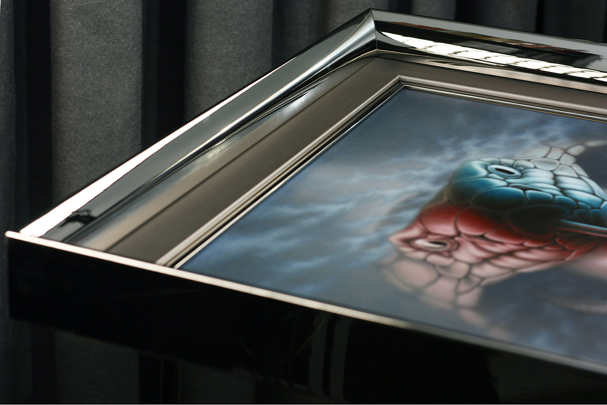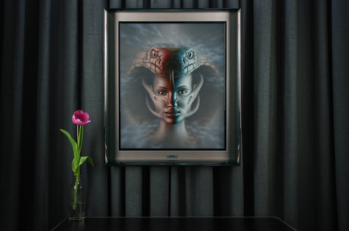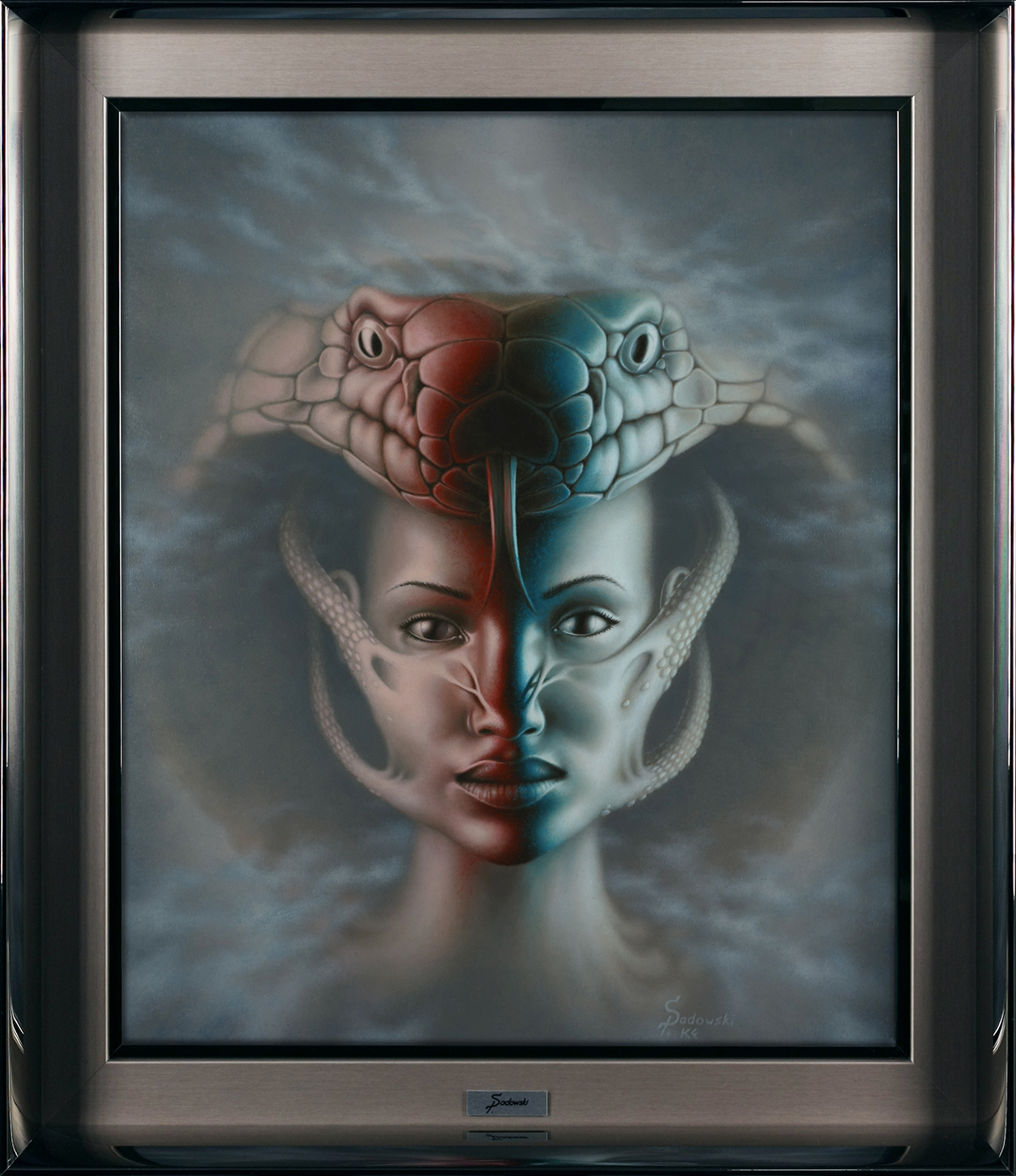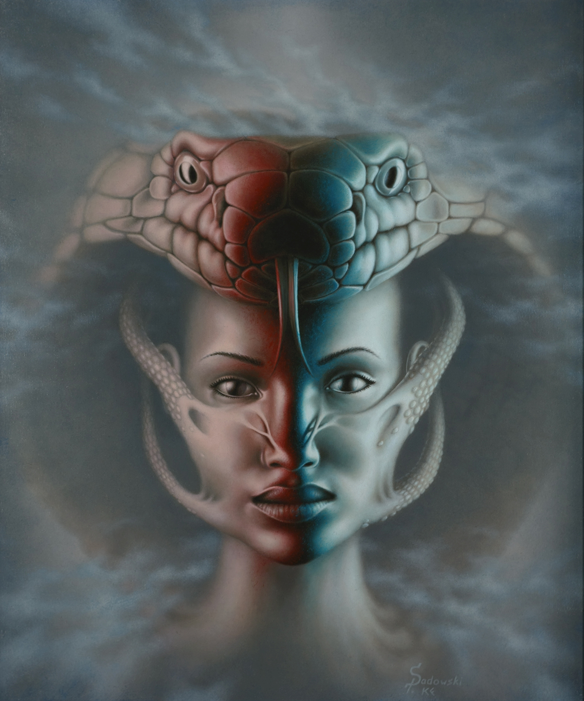 Tematem obrazu jest personifikacja fobii. Jest to zaburzenie objawiające się różnymi lękami, często nieuzasadnionymi. Jednak wynikające z nich problemy, są jak najbardziej realne. Warto o tym pamiętać, gdyż dla wielu osób, takie lęki są nie do przeskoczenia i nawet gdy stawią nim czoła, przysłowiowy strach nadal ma "wielkie oczy". A w przypadku tego obrazu - ofidiofobia "zawęża" perspektywy. Specyfikacja: Obraz olejny o formacie 60cm x 50cm (z ramą 73,5 cm x 63,5 cm) malowany na lnianym płótnie naciągniętym na blejtram. Oprawiony w trzy szare listwy ramowe błysk - mat - błysk. Gotowy do zawieszenia, werniksowany satynowym werniksem końcowym. Sygnatura "Sadowski P. KF". Do obrazu dołączony jest certyfikat autentyczności.