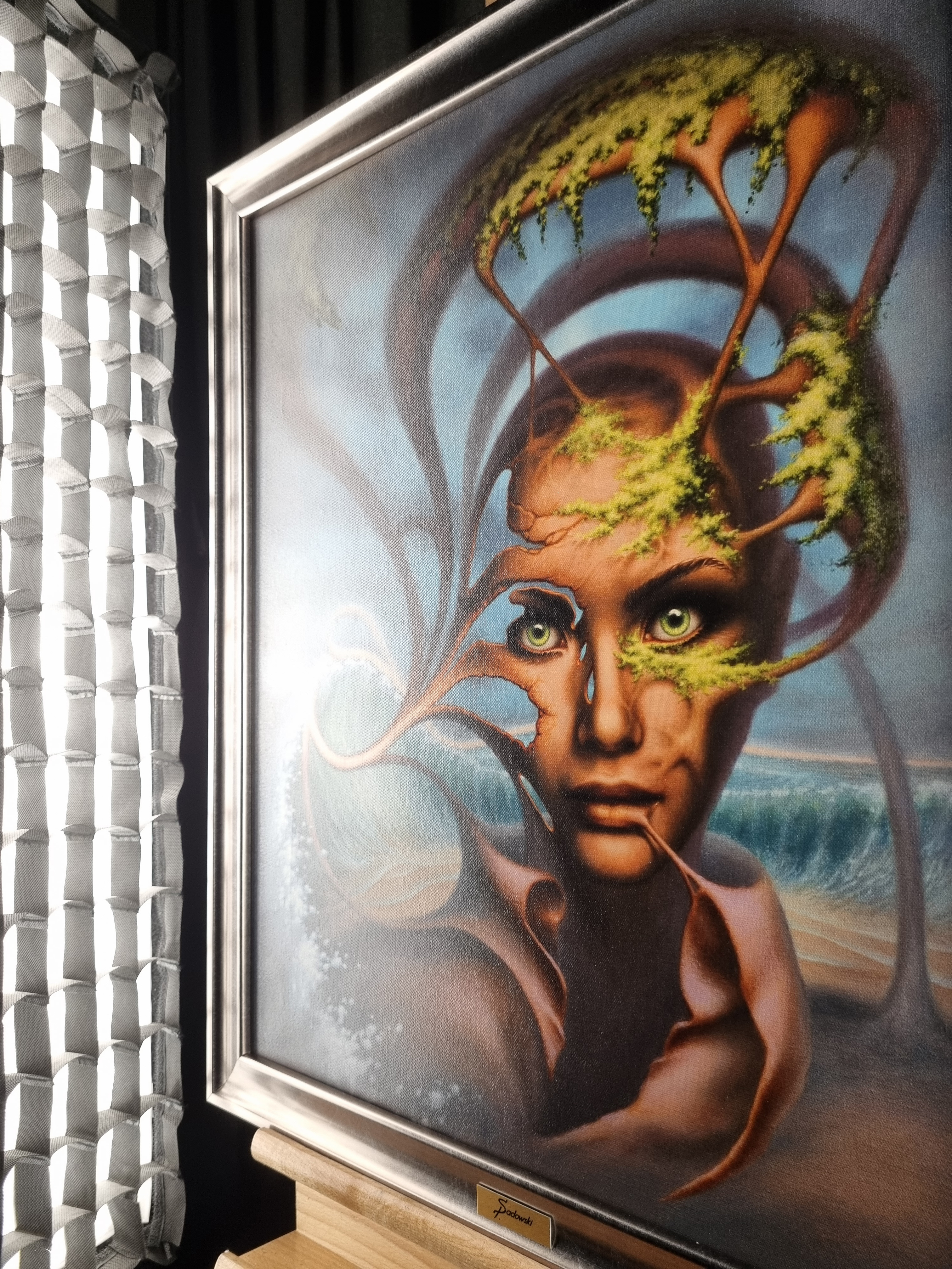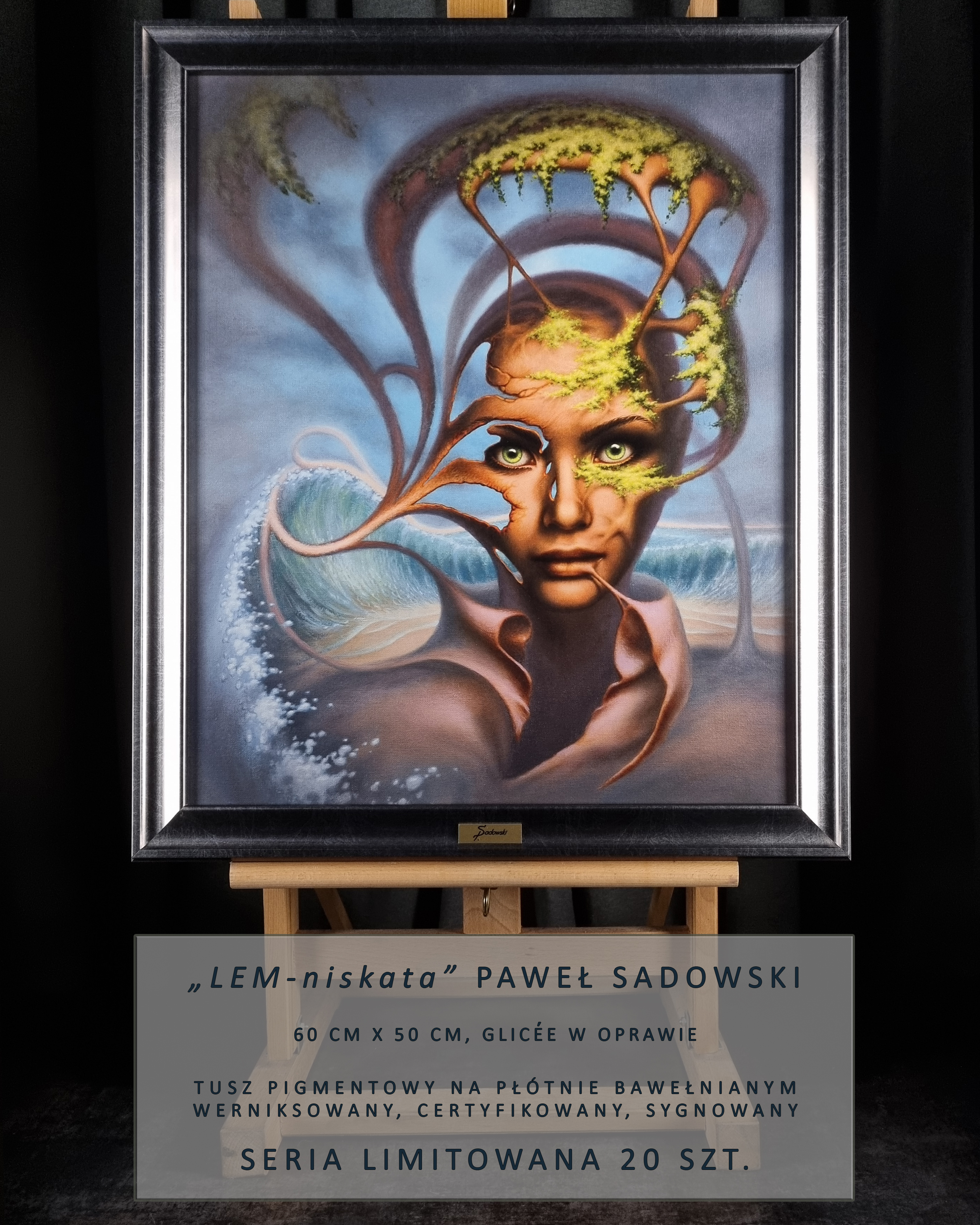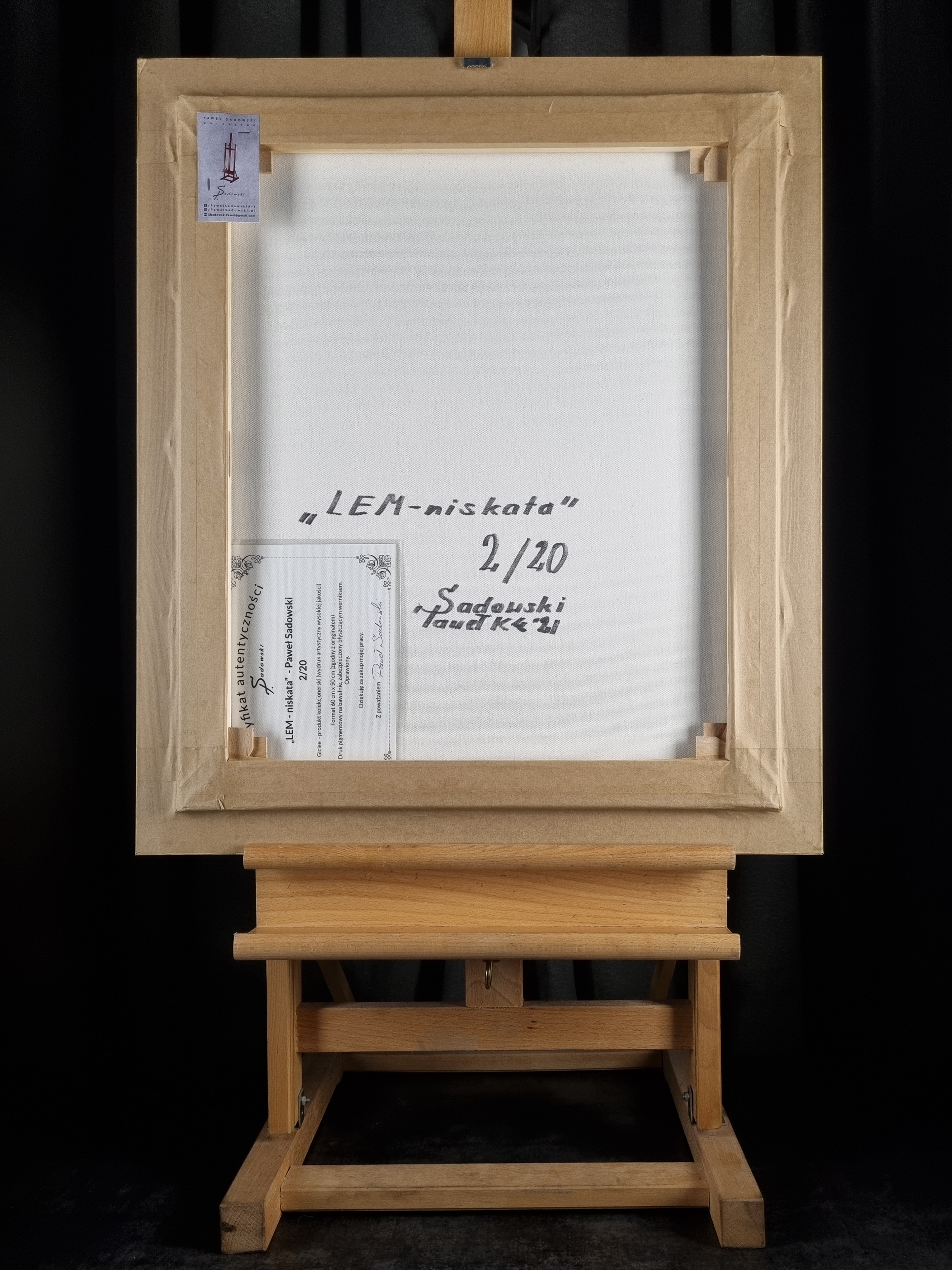 "LEM-niskata" Paweł Sadowski 2024r. Giclee na płótnie 60 cm x 50 cm. Produkt kolekcjonerski. Giclee stworzone na podstawie oryginalnego obrazu olejnego Pawła Sadowskiego z 2021 roku. Wysokiej jakości wydruk tuszem pigmentowym na płótnie bawełnianiym. Podwójnie werniksowany z satynowym połyskiem. Naciągnięty na drewniane krosno z klinami (możliwość naciągnięcia po latach) Oprawiony w stylizowaną ramę z grawerowaną sygnaturą autora. Na odwrociu, giclee podpisane jest tytułem, numerem serii, oraz sygnaturą: Sadowski Paweł KF i datą powstania oryginalnej pracy malarskiej. Do całości dołączony jest certyfikat autentyczności z powtórzonymi w/w danymi i oryginalnym autografem autora. "Im pełniej człowiek poznaje świat, tym bardziej nieobjęte otwierają się przed nim horyzonty." 13.09.2021r. - 100 rocznica urodzin Stanisława Lema. Obraz dedykuję jego dalekowzrocznej, niemal nieskończonej wyobraźni. Lem przewidział powstanie min. internetu, tabletów, audiobooków, smartfonów, druku 3D, nanotechnologii, symulacji komputerowej (np. Matrix), rzeczywistości wirtualnej, postprawdy i fakenewsów czy transhumanizmu.