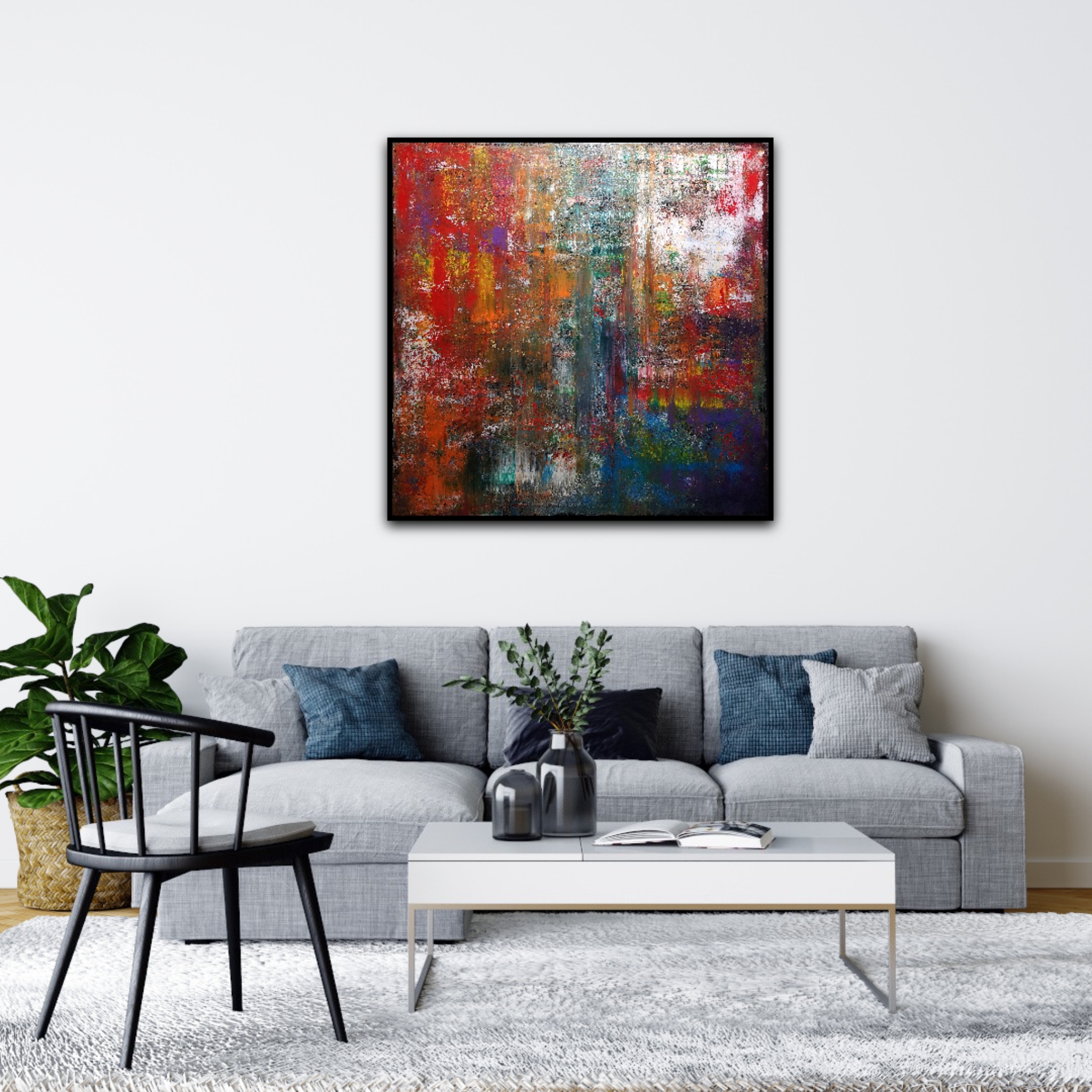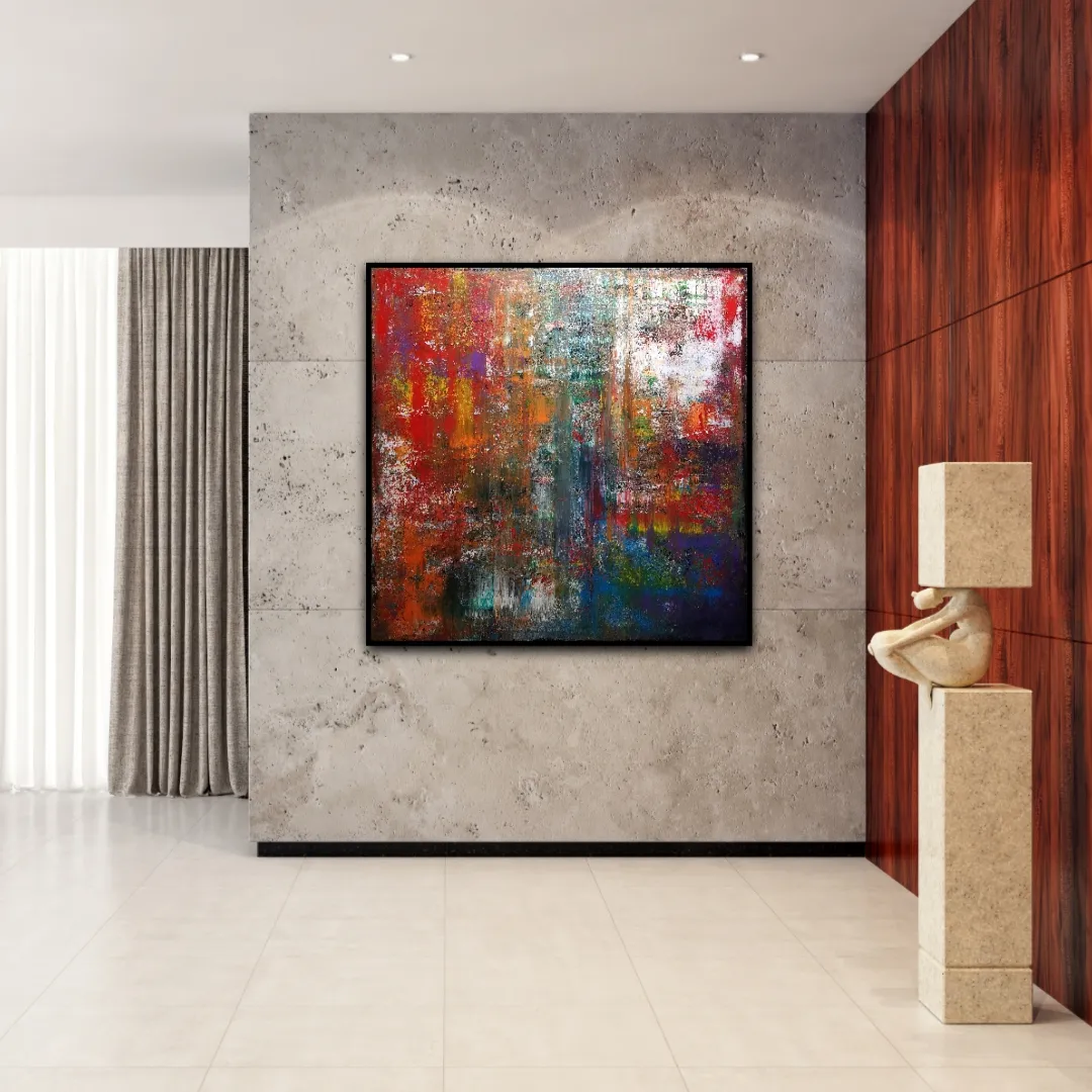 Ten obraz to istna eksplozja kolorów i emocji. Dominują tu ciepłe czerwienie i pomarańcze, które przeplatają się z chłodnymi błękitami i zieleniami. Kompozycja jest dynamiczna, jakby artysta celowo chciał zaszaleć z pędzlem. Ktoś mógłby powiedzieć, że to chaos, ale to chaos z precyzją, jak w dobrej muzyce rockowej. Atmosfera jest elektryzująca, przepełniona energią i napięciem. Styl przypomina ekspresjonizm abstrakcyjny. Plamy i linie są rozmazane, a tekstura nierówna, przez co pociągnięcia pędzla są wyraźnie widoczne. Techniki, jakich użyto, dają efekt głębi. Można niemal poczuć ten dynamizm na skórze. Obraz może wywoływać całą gamę emocji. Dla jednych będzie to radość, dla innych niepokój. Moje pierwsze wrażenie? Wow! To prawdziwy rollercoaster wizualny. Pomyślałem, że to jak oglądanie burzy z perspektywy artysty. Coś niesamowicie fascynującego i przyciągającego wzrok. Mały dziecko powiedziałoby: "To wygląda jak wielka plama farby!". W tej przypadkowej synchronizacji jest pewien "flow" – trochę jak w muzyce, która balansuje między chaosem a harmonią. To dzieło, które nie pozwala przejść obojętnie.