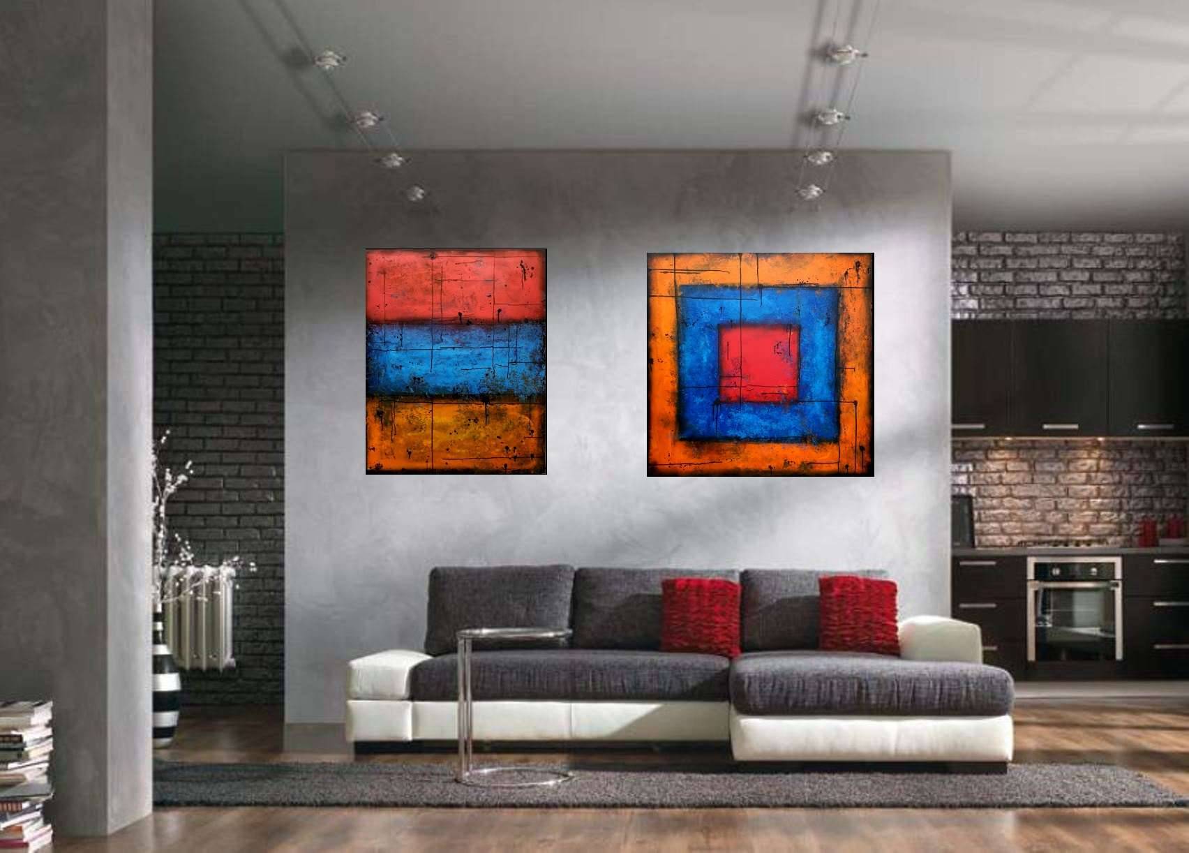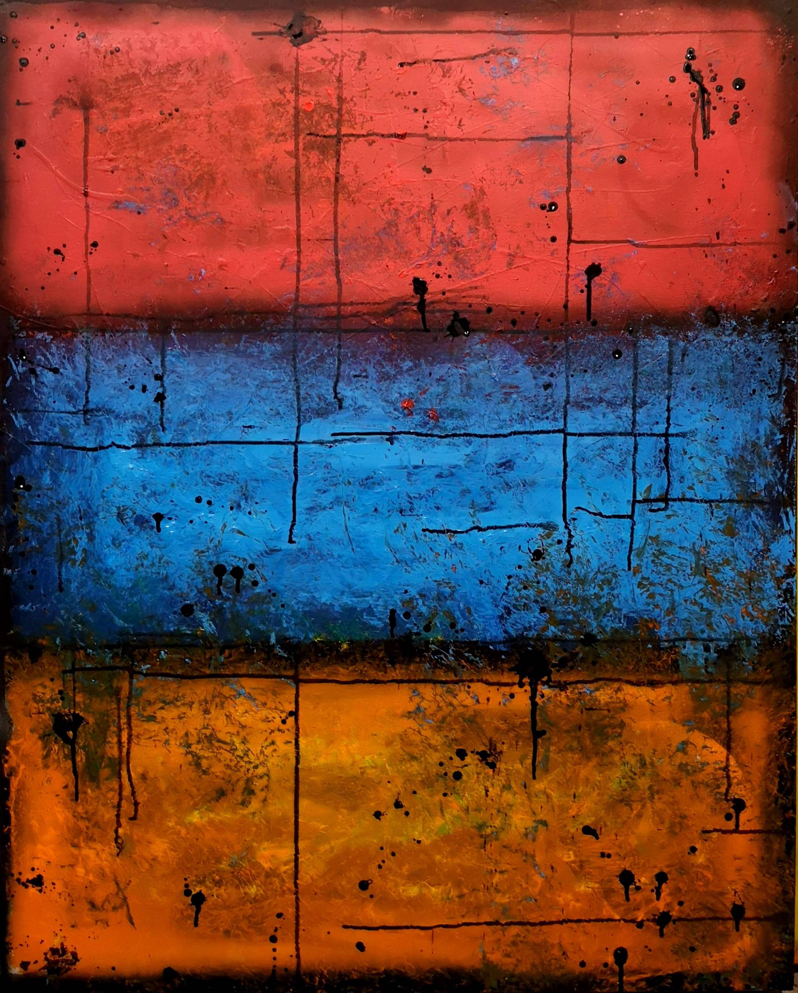 Kiedy patrzysz na ten obraz, pierwsze co rzuca się w oczy to intensywna paleta kolorów. Czerwony, niebieski i pomarańczowy tworzą dynamiczne, prostokątne płaszczyzny, które zdają się oddziaływać na siebie w chaotycznym tańcu. Linie przecinają kompozycję, tworząc fragmenty i zacieki, jakby artysta chciał pozostawić nieco przypadkowości w tej uporządkowanej abstrakcji. Te plamy i linie wyglądają jak rozlane wspomnienia, jakby ktoś rozpryskiwał emocje na płótno. Atmosfera? Jest pełna energii. Jest coś niespokojnego, ale i fascynującego. Przypomina dzień, kiedy niespodziewanie zaczyna padać deszcz, ale to dobra burza, pełna niespodzianek i power. Technika, której użyto, to zapewne akryl lub olej na płótnie. Dynamiczne pociągnięcia pędzlem i nasiąkające farbą kanwy pokazują kunszt i pełną ekspresji rękę twórcy. Obraz może wywoływać różne odczucia. Może odczuwać się spokój pod niebieskim niebem, a także nutę ciepła i bliskości, jaką daje pomarańczowy. Albo chaos i niepokój przez te chaotycznie rozrzucone plamy. Widz może poczuć się jak w centrum wiru życia. "Czy to nie wygląda jak kolorowa tęcza?" zapyta każde dziecko, które spojrzy na te barwy. Dla dorosłego, obraz może być refleksją nad zmiennością emocji i chwil ulotnych. W odbiorze, ten obraz to more niż tylko sztuka. To podróż przez kolory i formy, które choć nie mówią wprost, to krzyczą w nas swoją opowieścią.