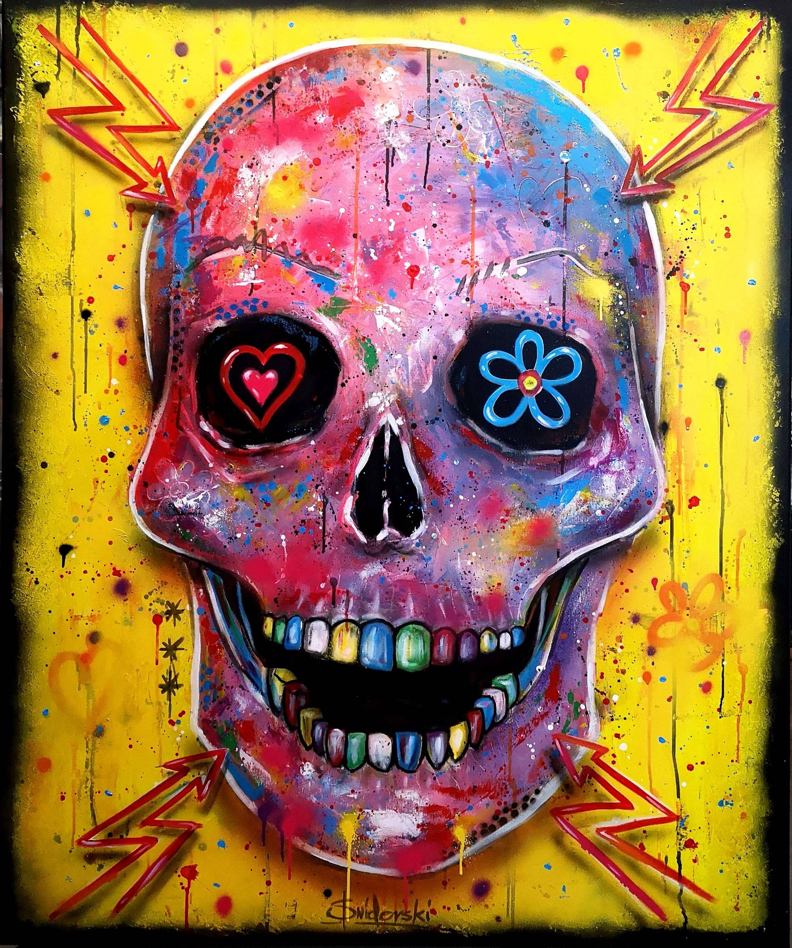 Ten obrazek to prawdziwa eksplozja kolorów, coś jak fajerwerki na niebie! Wyraźna czaszka pośrodku przyciąga wzrok - różowa, niebieska i czerwona, jakby była zanurzona w kalejdoskopie barw. Każde oko kryje inne światło: jedno to serduszko, a drugie to kwiatek. Tło w intensywnym, żółtym kolorze, wydaje się niemalże tętnić energią. Uczuć i emocji tutaj nie brakuje - jest zaskoczenie, jest energia, jest może trochę grozy, ale takiej z przymrużeniem oka. Styl to totalna fiesta. Artysta użył technik przypominających graffiti, z odważnymi konturami i dynamicznymi plamami farby. Wszechobecne strzały, niczym błyskawice, dodają dynamizmu i ruchu. Patrząc na to dzieło, można poczuć się jak na koncercie rock’n’rolleowym. Jest wow. Dla dzieciaka może to być trochę straszne, bo głowa się uśmiecha, ale przecież to tylko obrazek, prawda? To dzieło z pewnością budzi emocje - może nawet jakąś burzę myśli o życiu i śmierci, ale taką pełną kolorów. Ta mieszanka form i kolorów tworzy istną "madness", gdzie wzrok widza wędruje od jednego elementu do drugiego, nie wiedząc na czym się skupić. Atmosfera jest pełna życia, może trochę surrealistyczna, ale na pewno niezapomniana.