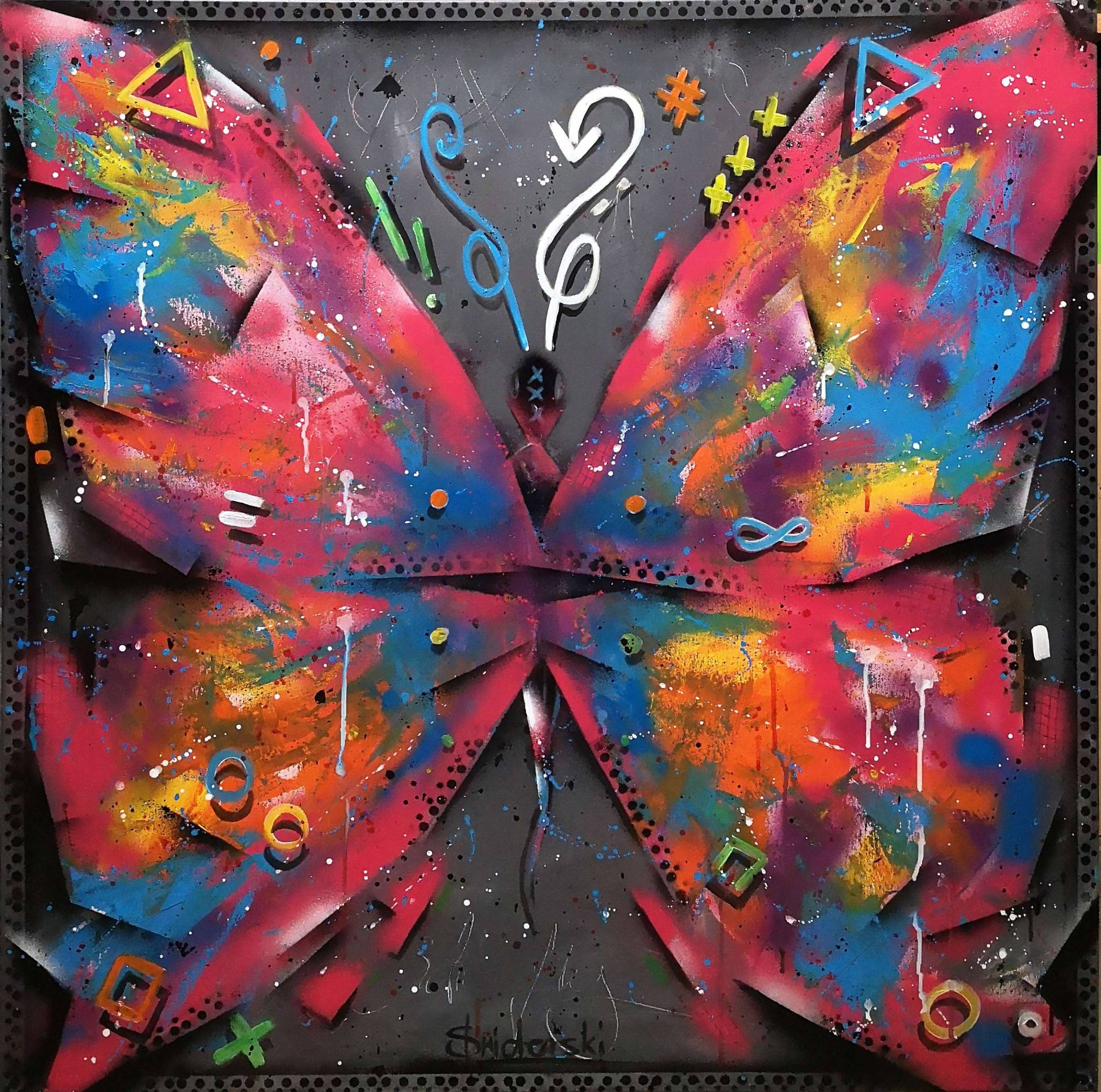 Obraz przedstawia dynamiczną kompozycję pełną kolorowych pociągnięć, które układają się w kształt motyla na ciemnym tle. Skrzydła wybuchają kolorami: nasycona czerwień, intensywny niebieski, pulsująca zieleń i słoneczny żółty. Całość otaczają geometryczne wzory – tu trójkąt, tam nieskończoność, wszystko w chaosie i harmonii zarazem. Ta mieszanka kolorów i form przypomina mi jakby wybuch kreatywności, jakby ktoś nagle powiedział: "Wow, artystyczny wildness!" Atmosfera bije z tego obrazu niezwykle wyrazista. Jest dynamiczna, żywa, pełna ekscytacji. To jakby zatrzymać chwilę pełną energii i nadziei. Wykorzystane techniki przypominają graffiti z miast – mocne kontury, rozpylone farby, warstwowe faktury. Spraye, pędzle i zapewne artystowska odwaga. Dzieło może wywoływać mieszankę emocji – od radości z żywiołowych barw, po refleksję nad chaosem w naszym życiu. Patrząc na to, myślę o dzieciństwie, kiedy wierzyliśmy, że wszystko jest możliwe. To obraz, który zaprasza do zanurzenia się w jego świecie. Czuję, że to taka kolorowa eksplozja, która przywołuje uśmiech i przypomina, że świat jest pełen możliwości. Jest po prostu super!