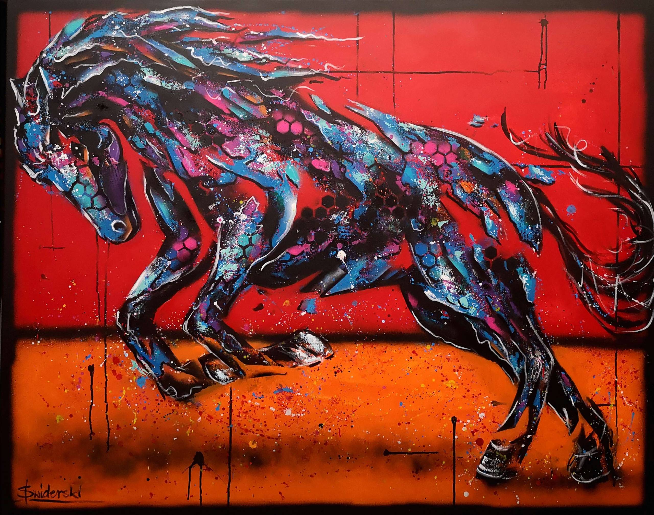 Na obrazie widzimy dzikiego konia pełnego dynamiki i energii. Tło jest intensywnie czerwone, przypominające zachód słońca, które dodaje dramatyzmu całej kompozycji. Koń zdaje się być namalowany eksplozją kolorów: dominuje elektryczny błękit, róż i fiolet, które nakładają się na siebie, tworząc mozaikę z geometrycznymi wzorami. Te wyraziste barwy kontrastują z czarnymi konturami, które podkreślają muskulaturę i ruch zwierzęcia. Artysta zastosował technikę drippingu, co daje wrażenie, że obraz żyje, a koń jest w ciągłym ruchu. Całość jest pełna spontaniczności i luzu, tak jakby twórca chciał przedstawić moment "in motion" zamknięty w kadrze. Malowanie takim stylem sprawia, że odbiorca czuje się prawie jak uczestnik tego dynamicznego widowiska. Ten obraz może wywoływać emocje wolności, siły i odrobiny szaleństwa. Dziecko mogło by powiedzieć: "Patrz, koń jest jak kolorowy piorun!". To dzieło łączy w sobie nieszablonową ekspresję i mocny wyraz artystyczny, sprawiając, że chce się na nie patrzyć bez końca.