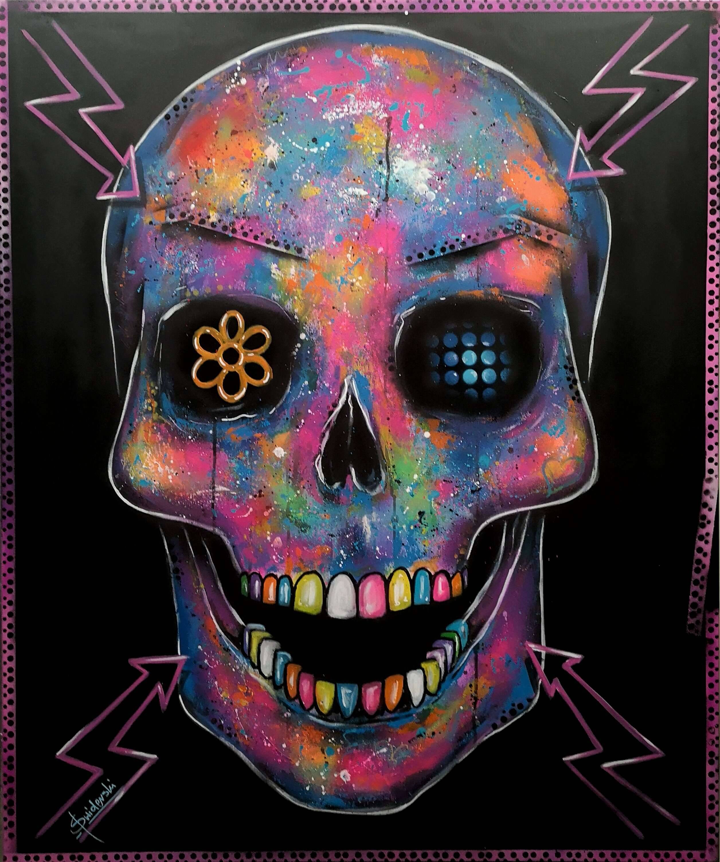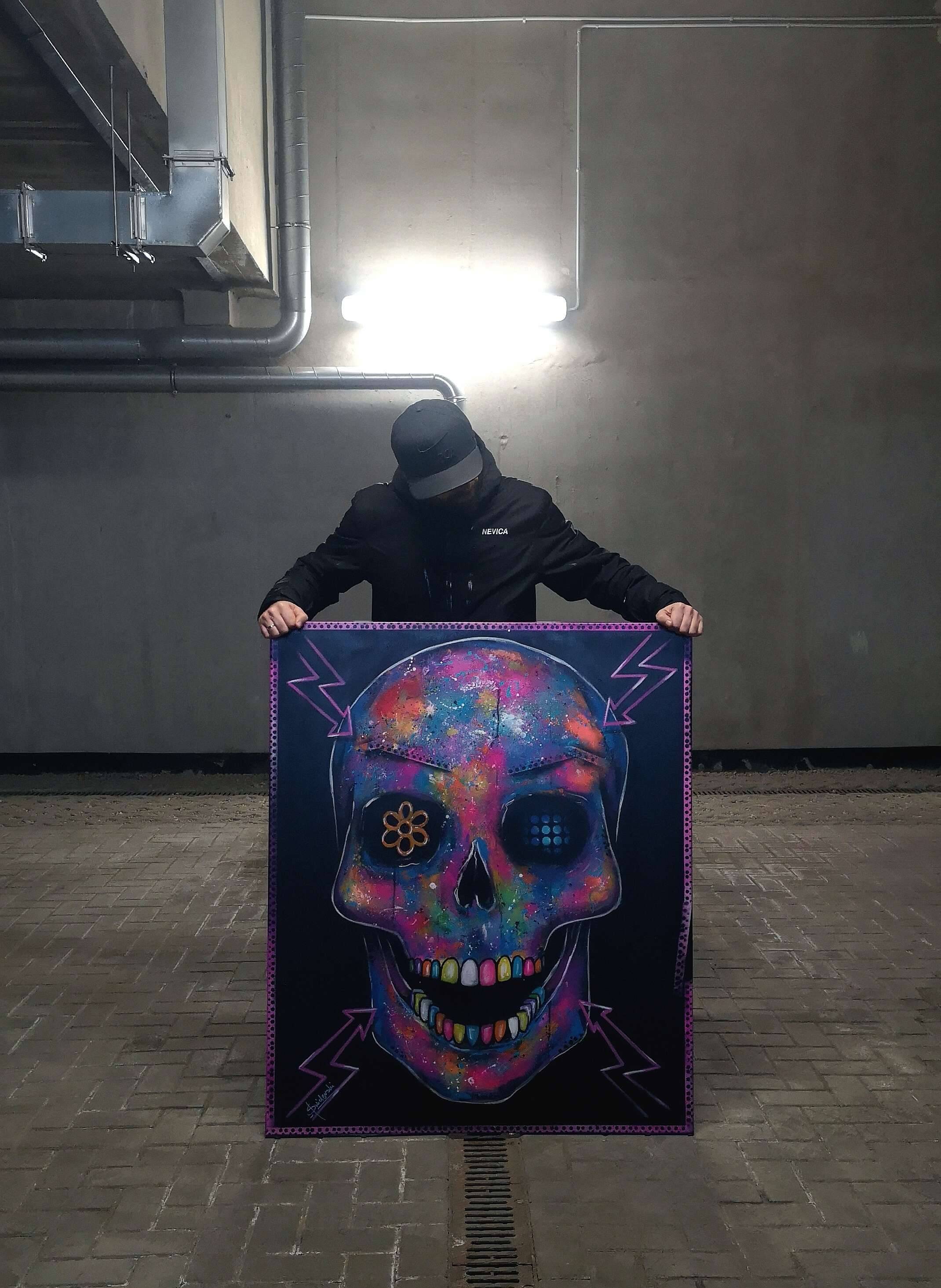 Na obrazie dominuje czaszka, ale nie jest to zwykła czaszka. Pokryta wielobarwnymi plamami, które przypominają eksplozję tęczy. Kolory migoczą, od błękitów, przez różowe, po intensywne żółcie. Wygląda jakby ktoś rozrzucił galaktykę na czarnym tle. Na jednym oku błyszczy kwiatek, a drugie jest jakby kropkowane. Wygląda to jak party w stylu pop art. Zęby są kolorowe, jak cukierki, i wydaje się, że czaszka uśmiecha się pełnym blaskiem. Nastrój jest jednocześnie wzniosły i niepokojący. Whoa! Pomyślałby ktoś zapatrzony w to dzieło sztuki. Artysta użył techniki sprayu, co dodaje mu dynamiczności. Czaszka emanuje energią, jakby chciała powiedzieć, że śmierć też może być cool. Można poczuć mieszankę grozy i fascynacji. Myśli siedmiolatka: "To chyba czaszka z kosmosu". Obraz sprawia, że zaczynasz myśleć o przemijaniu, ale w sposób, który jest bardziej intrygujący niż smutny. Artyście udało się zamknąć w tej kompozycji paradoks, gdzie zabawa styka się z tajemnicą.