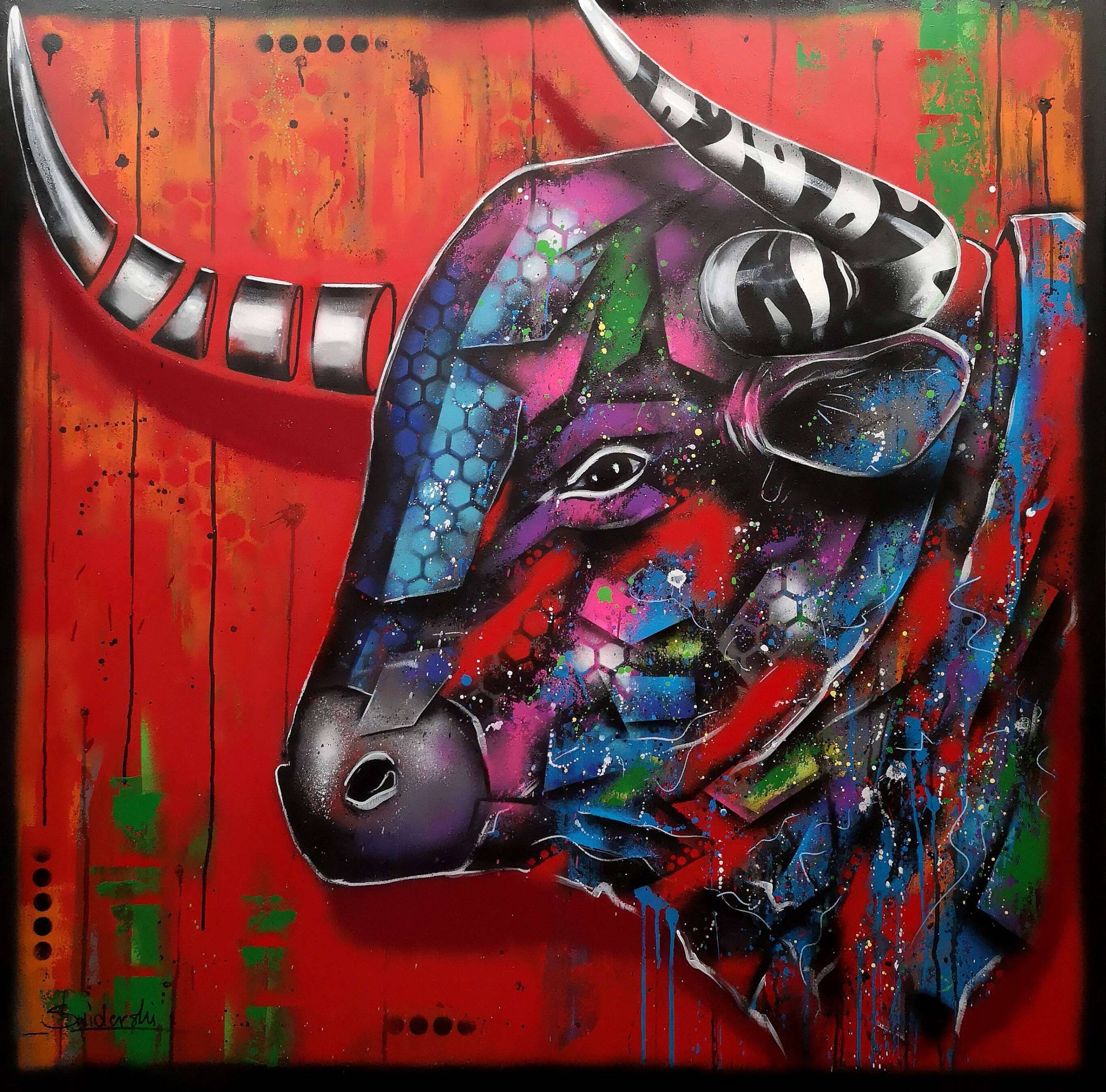 Na obrazie widzimy dynamiczny i energetyczny portret byka, który zdaje się wręcz rozsadzać czerwone tło. Pełne życia kolory — głównie odcienie niebieskiego, fioletu oraz soczyste czerwienie — tworzą żywą mozaikę, a ich kontrast z czernią rogów dodaje dramatu. Artysta użył odważnej palety, mieszając farby w sprayu z akrylowymi plamami i precyzyjnymi konturami. Kompozycja emanuje energią i siłą, co przywodzi na myśl słowo "power", które idealnie oddaje nastrój dzieła. Atmosfera jest intensywna i nieco chaotyczna, niczym byk rozgniewany w arenie. Na pewno to przyciąga i fascynuje, a może nawet budzi pewien niepokój. Złożoność wzorów na skórze byka symbolizuje różnorodność interpretacji, pozwalając każdemu dostrzec coś innego. Ja widzę w tym nieokiełznaną energię natury i siłę charakteru, ale ktoś inny mógłby dostrzec po prostu piękno dzikiej zwierzyny. Obraz jest malowany w stylu street artu, przez co zyskuje nowoczesny i odważny wygląd. Technika łączy swobodę z precyzją, co podkreśla kontrast między chaosem tła a wyrazistością samego byka. Obraz może wywołać burzę emocji, od podziwu po niepokój. Dla siedmiolatka stałby się pewnie fascynujący. "Ojej, ten byk wygląda jakby zaraz miał wyskoczyć z ramki!", mógłby powiedzieć mały widz. Ten obraz, choć na pierwszy rzut oka może wydawać się zbyt intensywny, zdecydowanie zostawia trwały ślad w pamięci.
