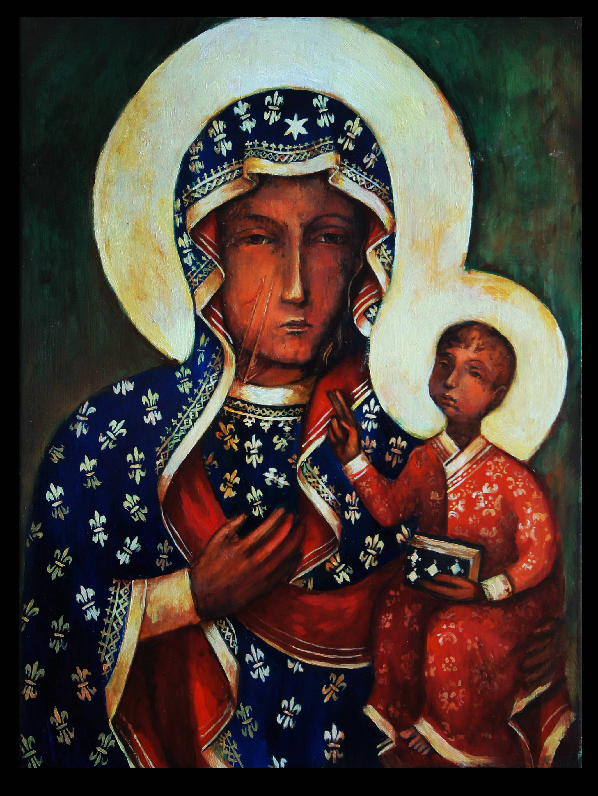 Kopia Ikony przedstawiającej Matkę Boską Częstochowską wykonana na płótnie farbami olejnymi. Obraz zawerniksowany, pięknie oddający kolory i klimat oryginału.